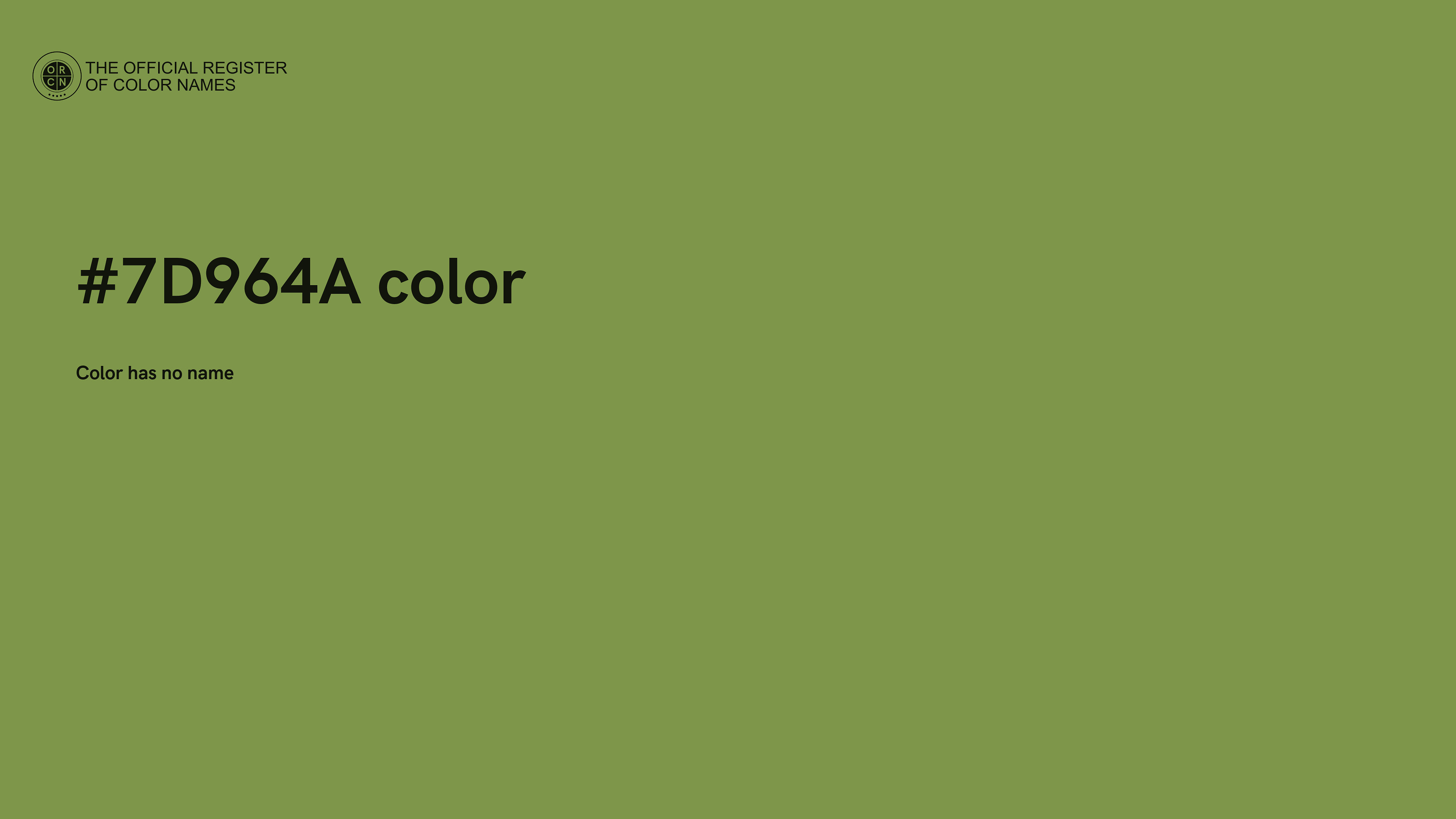 The digital color HEX #7D964A belongs to the Chartreuse Color Family featuring Mild Saturation (Saturation Family) and Light (Brightness Family).
