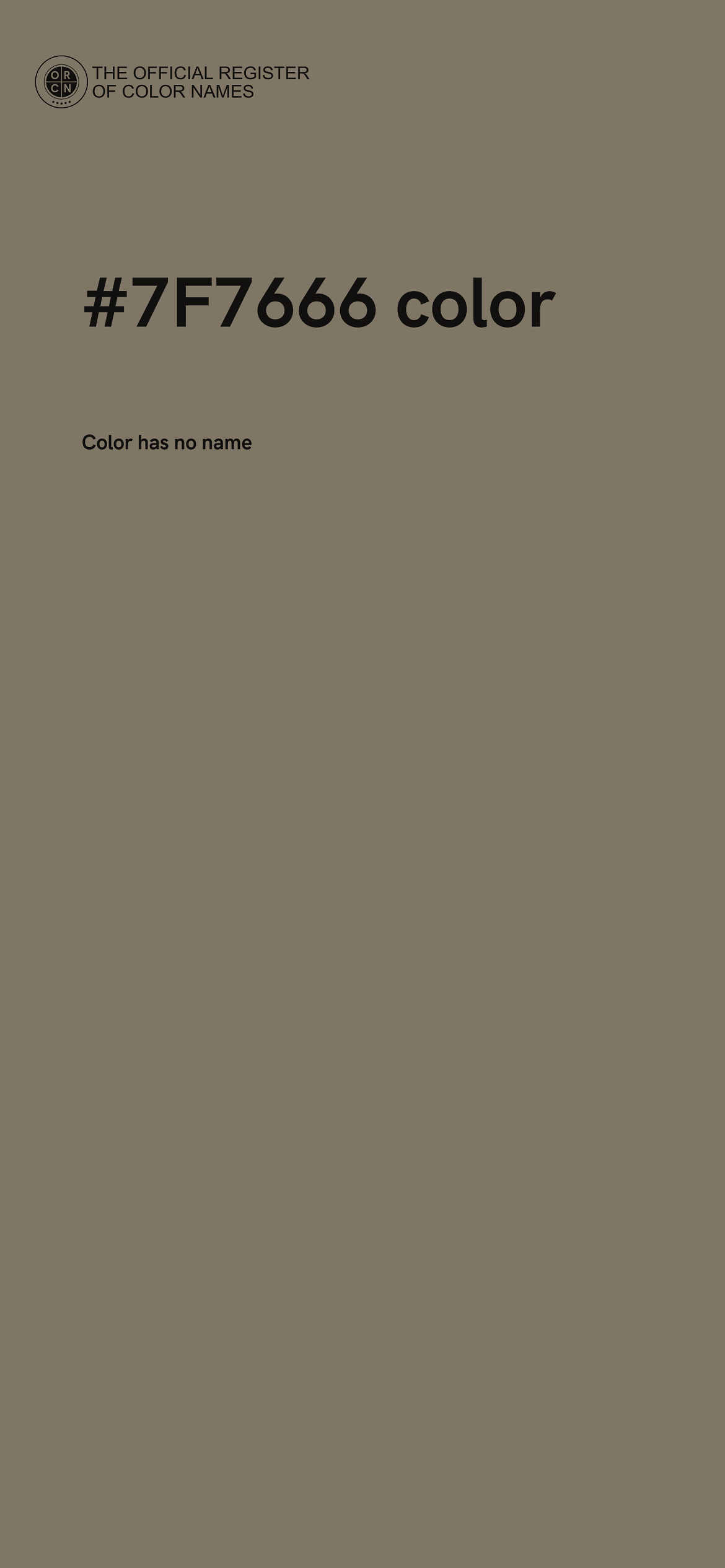 The digital color HEX #7F7666 belongs to the Orange Color Family featuring Low Saturation (Saturation Family) and Light (Brightness Family).
