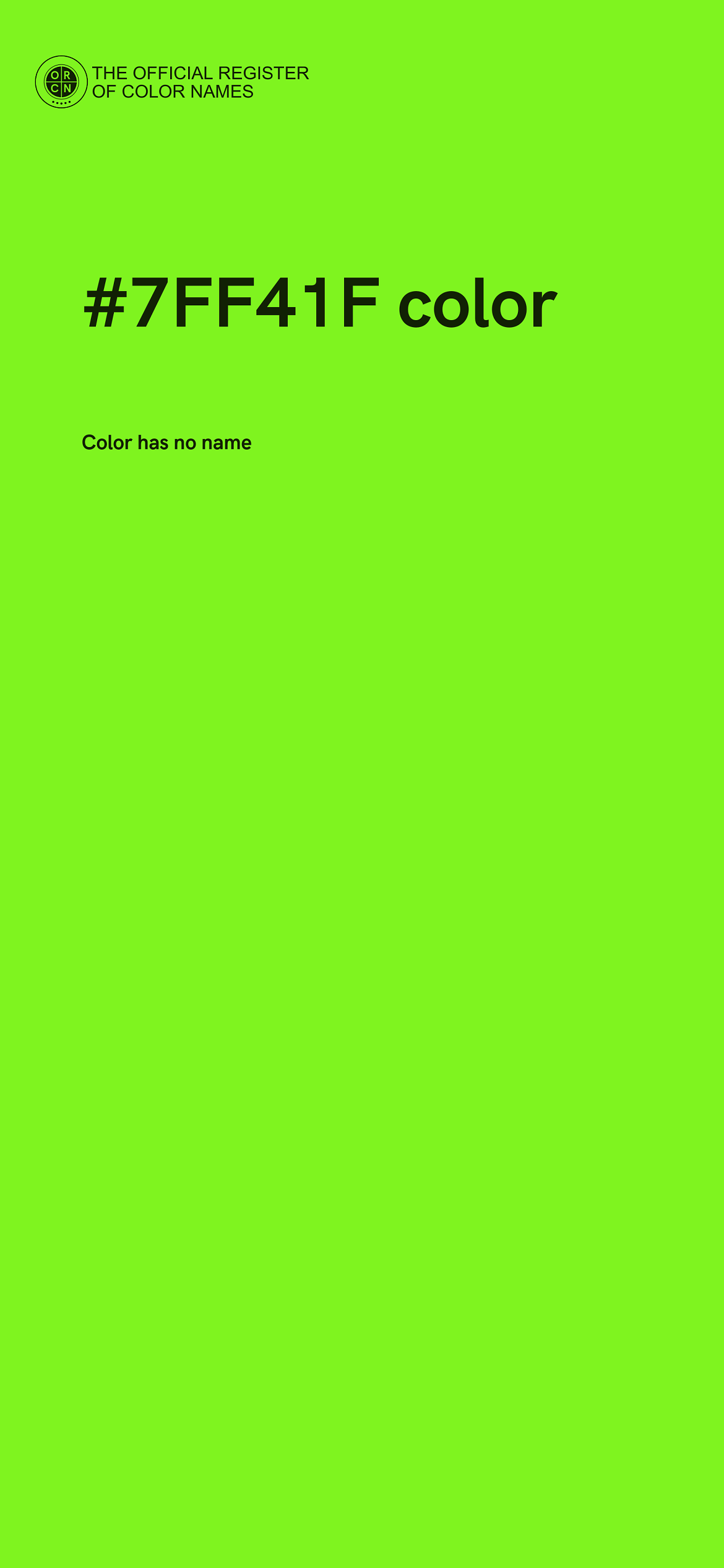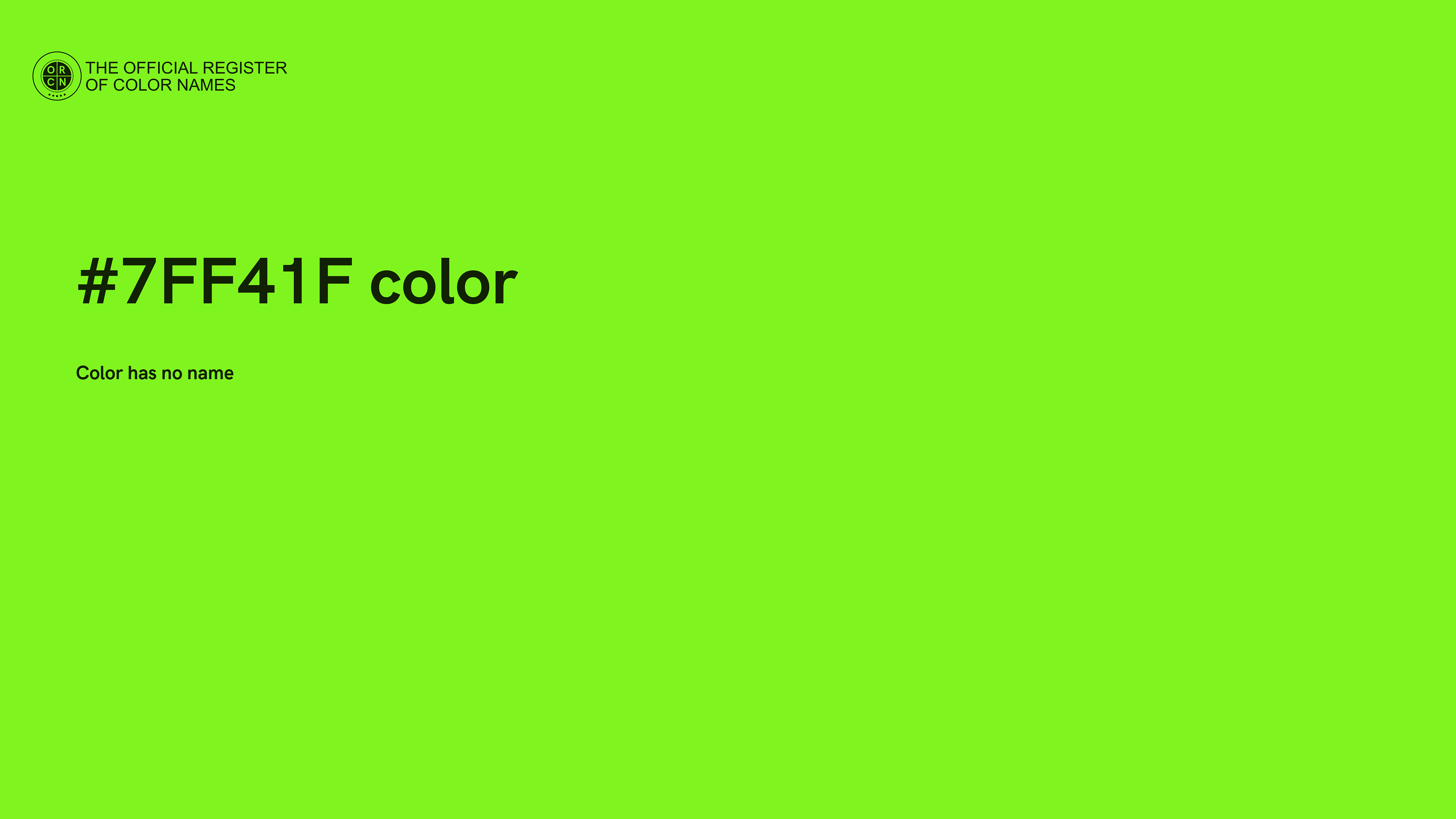 The digital color HEX #7FF41F belongs to the Chartreuse Color Family featuring Full Saturation (Saturation Family) and Light (Brightness Family).
