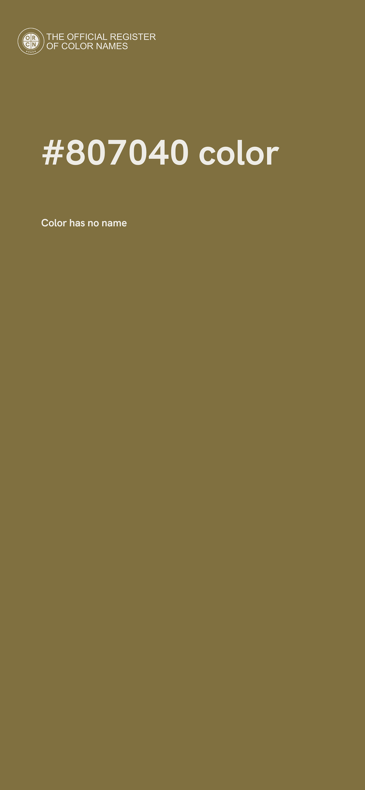 The digital color HEX #807040 belongs to the Yellow Color Family featuring Mild Saturation (Saturation Family) and Neutral (Brightness Family).