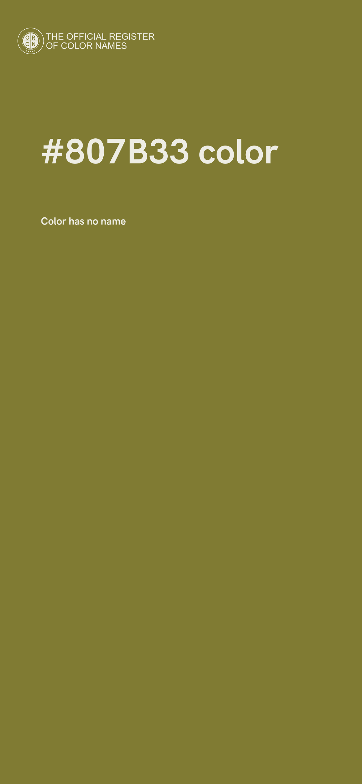The digital color HEX #807B33 belongs to the Yellow Color Family featuring Moderate Saturation (Saturation Family) and Neutral (Brightness Family).