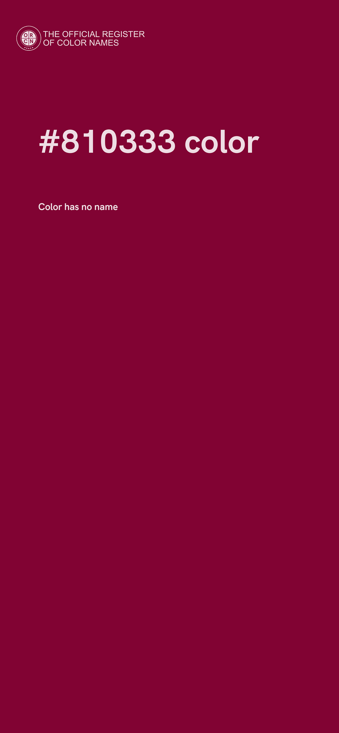 The digital color HEX #810333 belongs to the Rose Color Family featuring Full Saturation (Saturation Family) and Neutral (Brightness Family).