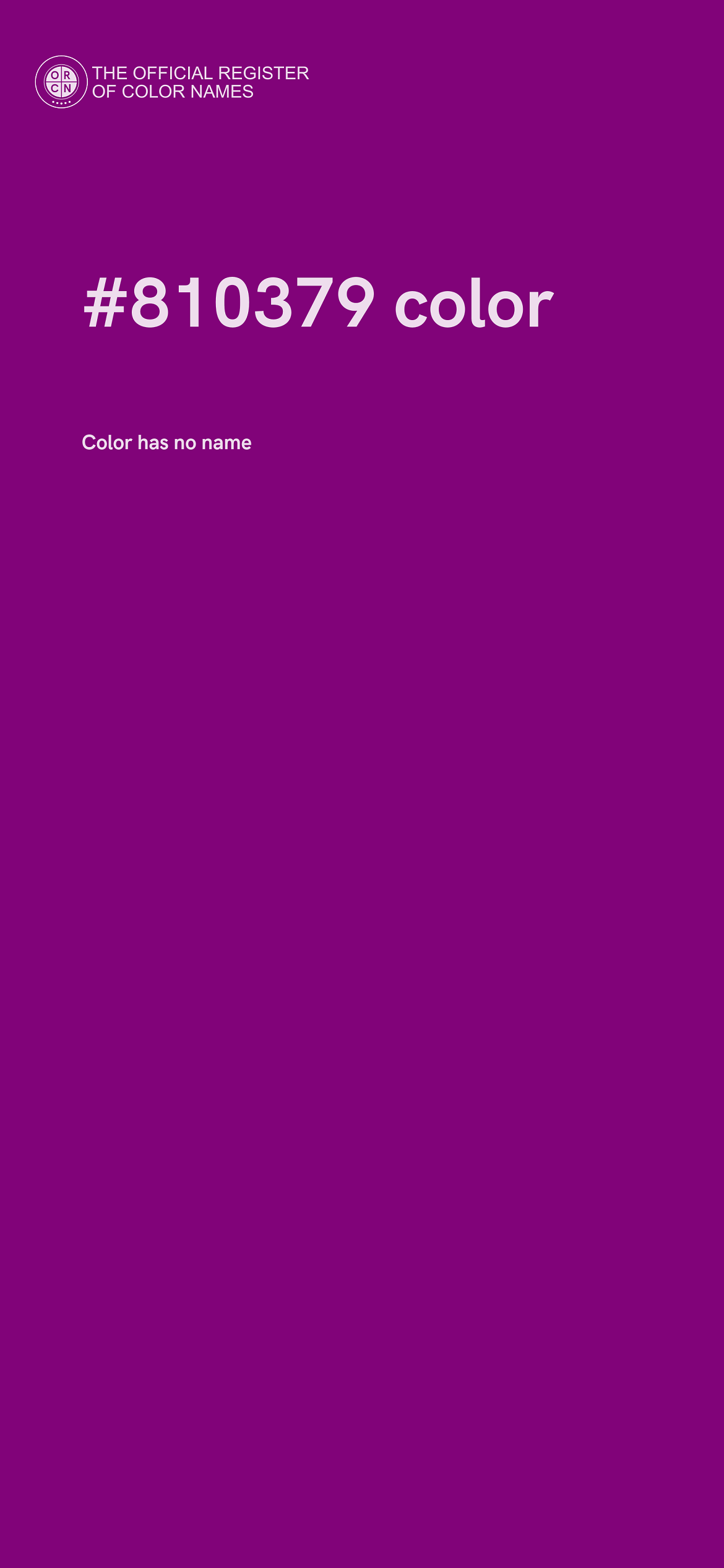 The digital color HEX #810379 belongs to the Magenta Color Family featuring Full Saturation (Saturation Family) and Neutral (Brightness Family).