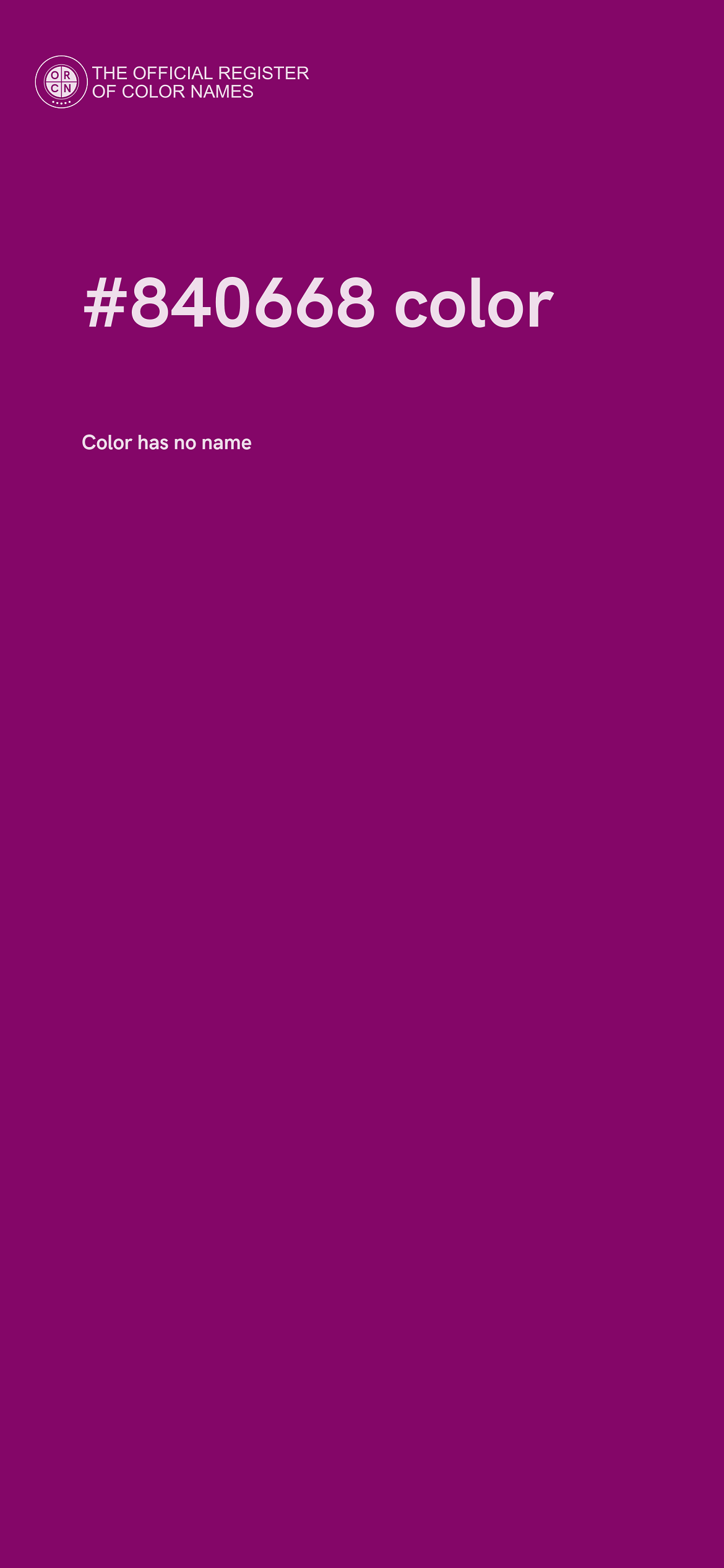 The digital color HEX #840668 belongs to the Magenta Color Family featuring Full Saturation (Saturation Family) and Neutral (Brightness Family).