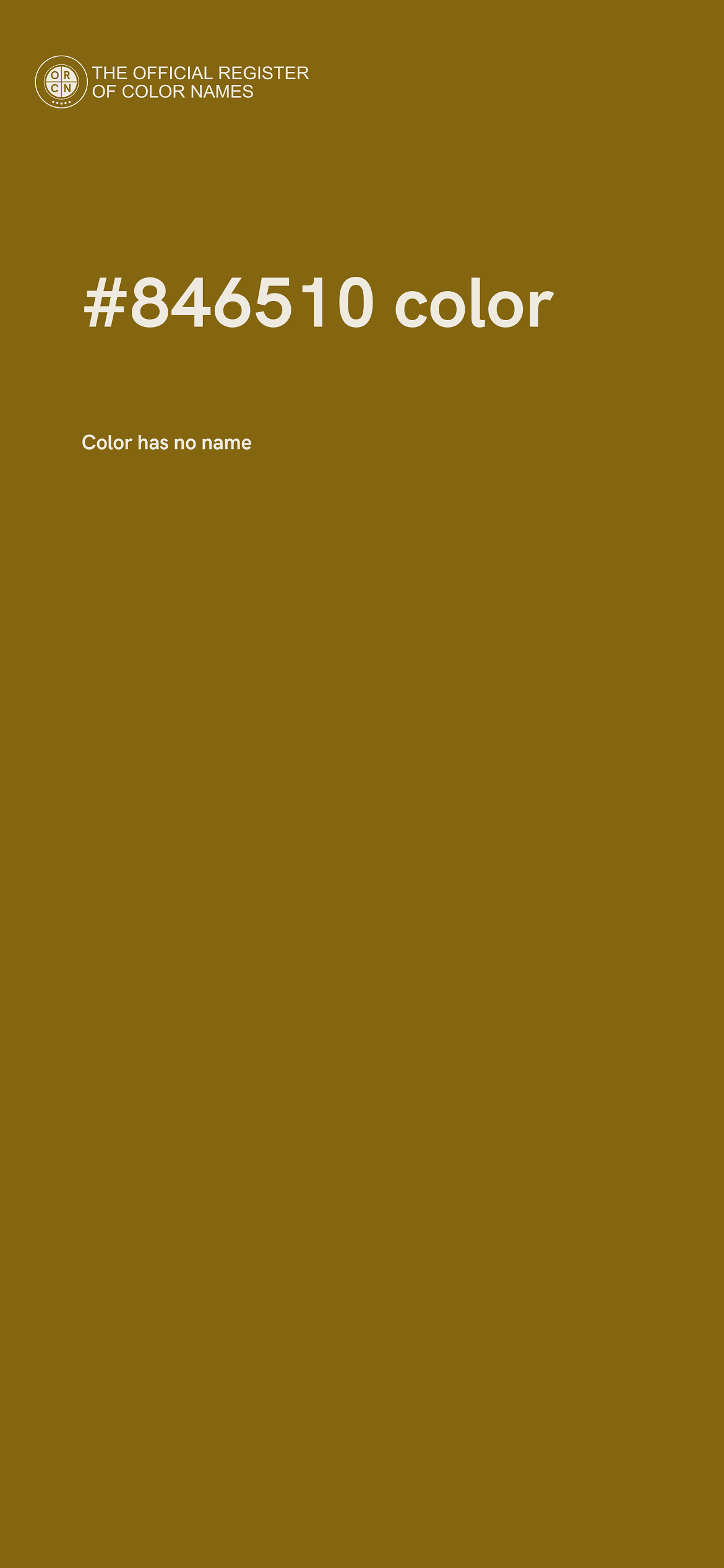 The digital color HEX #846510 belongs to the Orange Color Family featuring High Saturation (Saturation Family) and Neutral (Brightness Family).