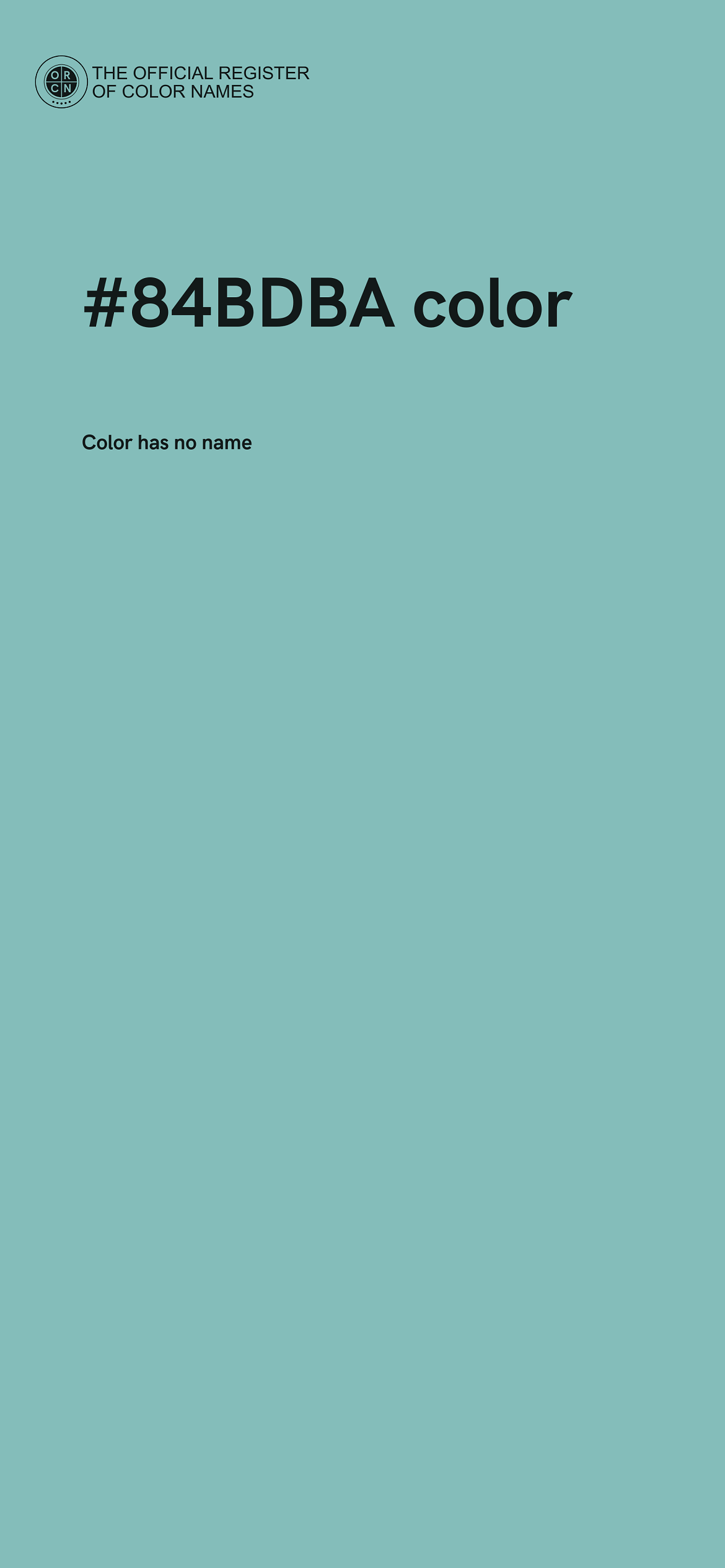 The digital color HEX #84BDBA belongs to the Cyan Color Family featuring Mild Saturation (Saturation Family) and Very Light (Brightness Family).