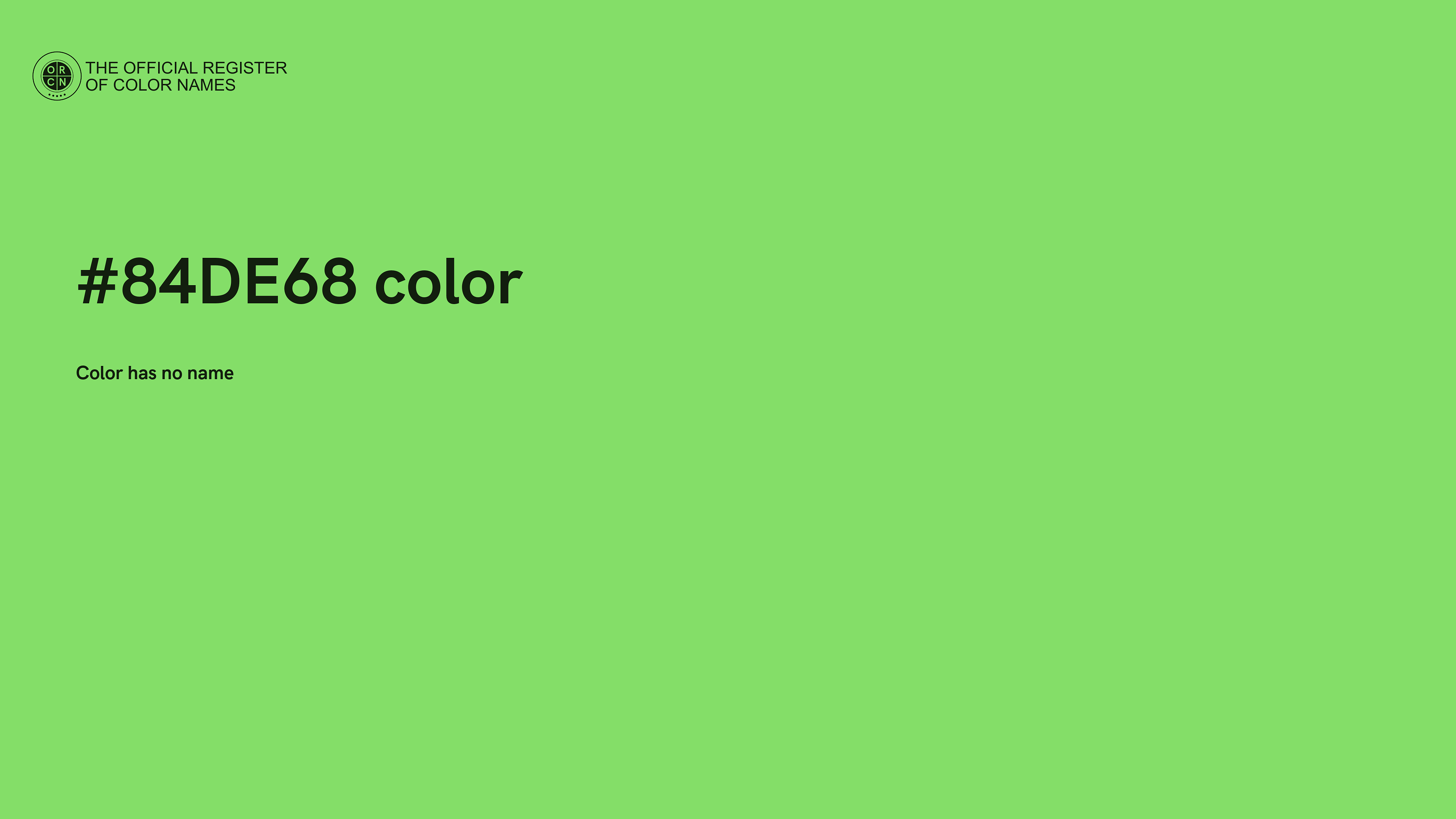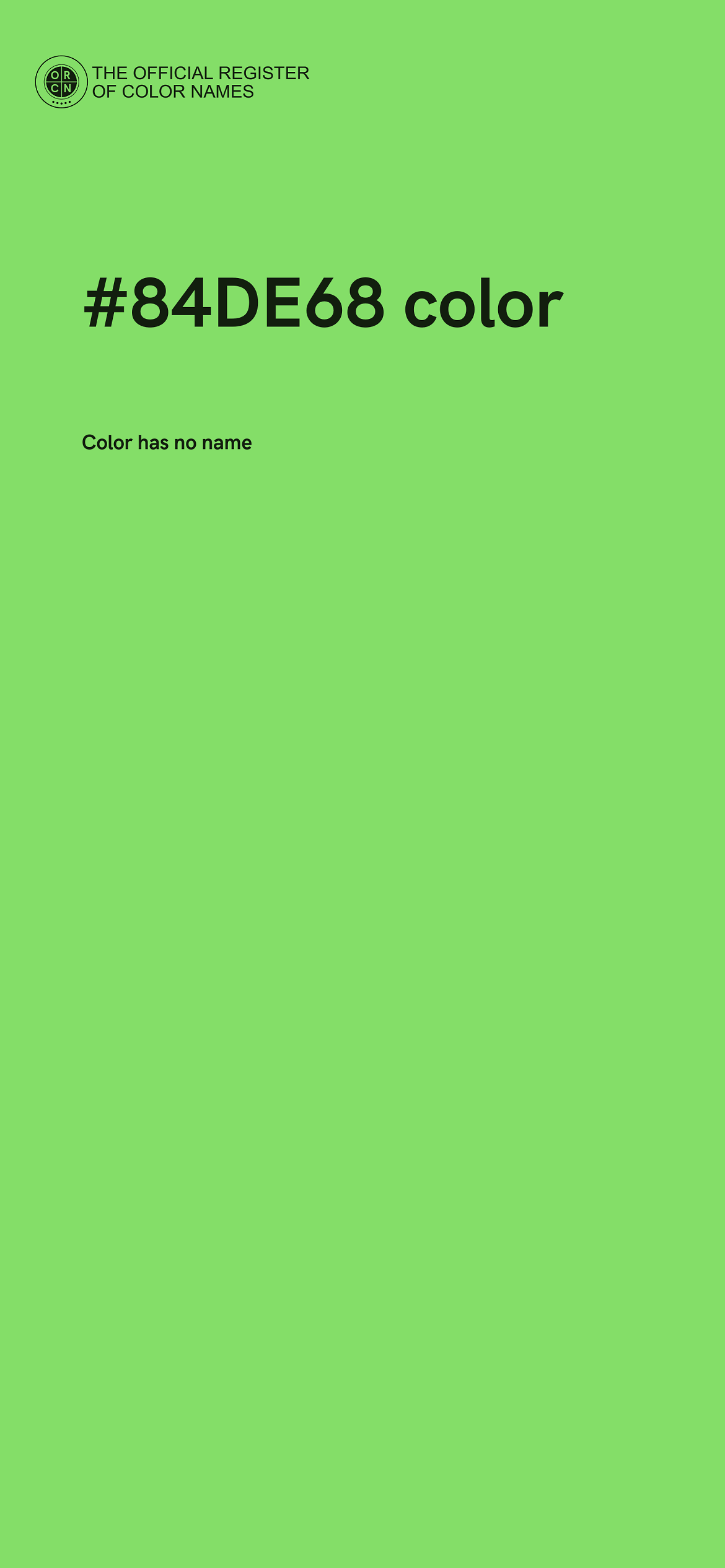 The digital color HEX #84DE68 belongs to the Green Color Family featuring High Saturation (Saturation Family) and Very Light (Brightness Family).