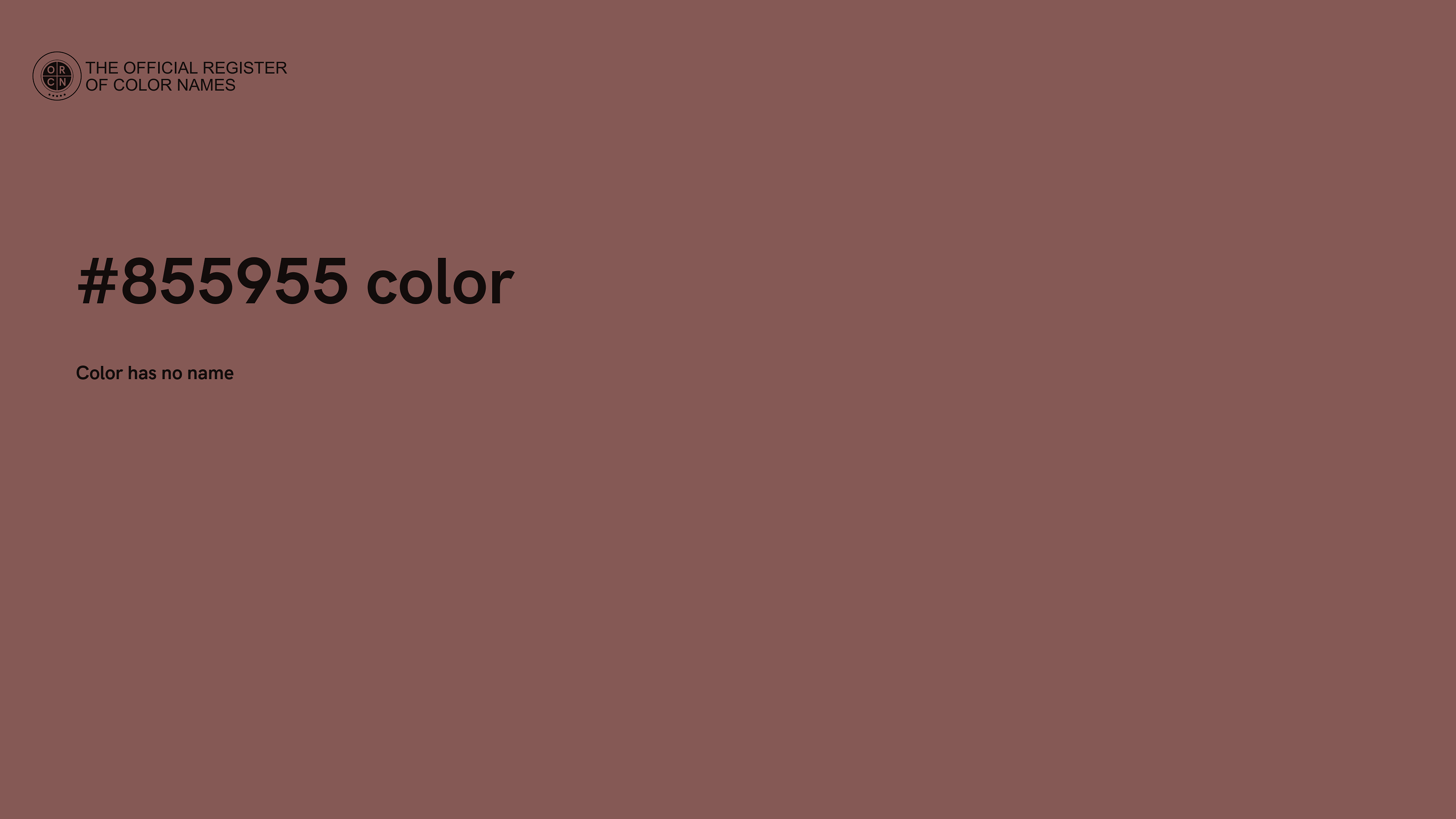 The digital color HEX #855955 belongs to the Red Color Family featuring Low Saturation (Saturation Family) and Light (Brightness Family).