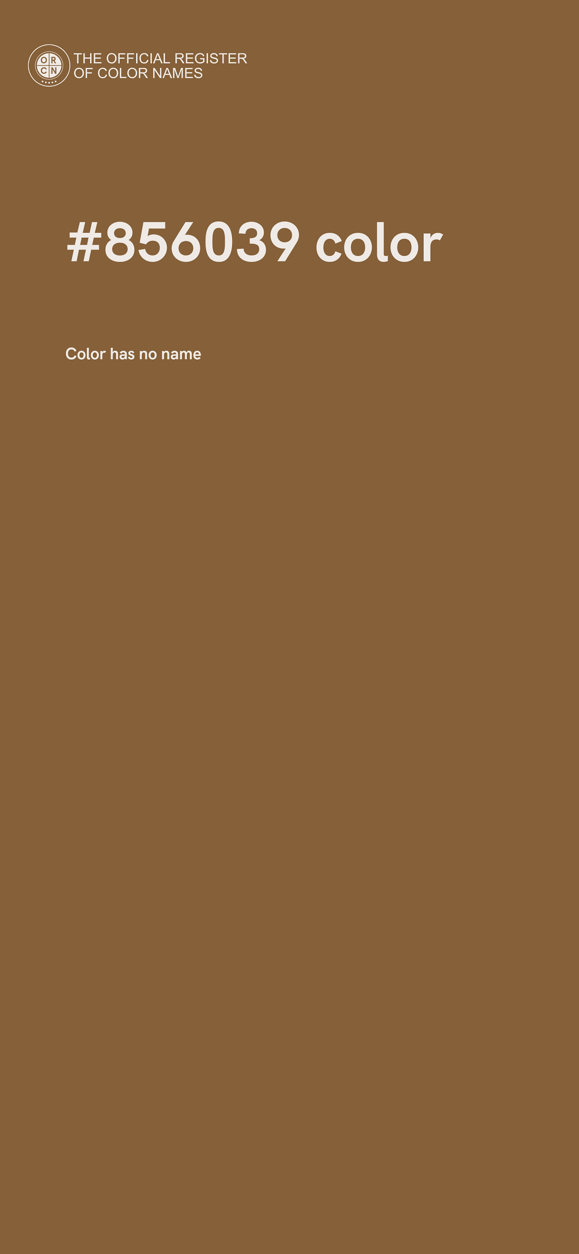 The digital color HEX #856039 belongs to the Orange Color Family featuring Moderate Saturation (Saturation Family) and Neutral (Brightness Family).