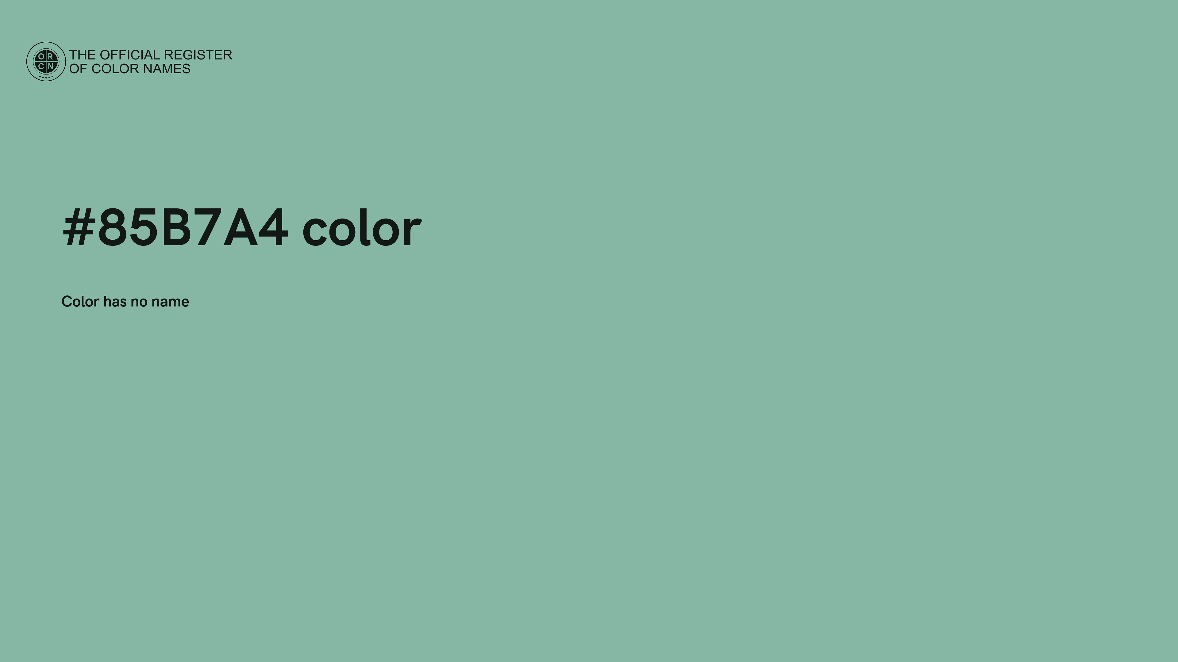 For printing in non digital world, #85B7A4 is represented in CMYK as 20 Cyan, 0 Magenta, 7 Yellow, and 28 Black (Key) (C:20 M:0 Y:7 K:28).
