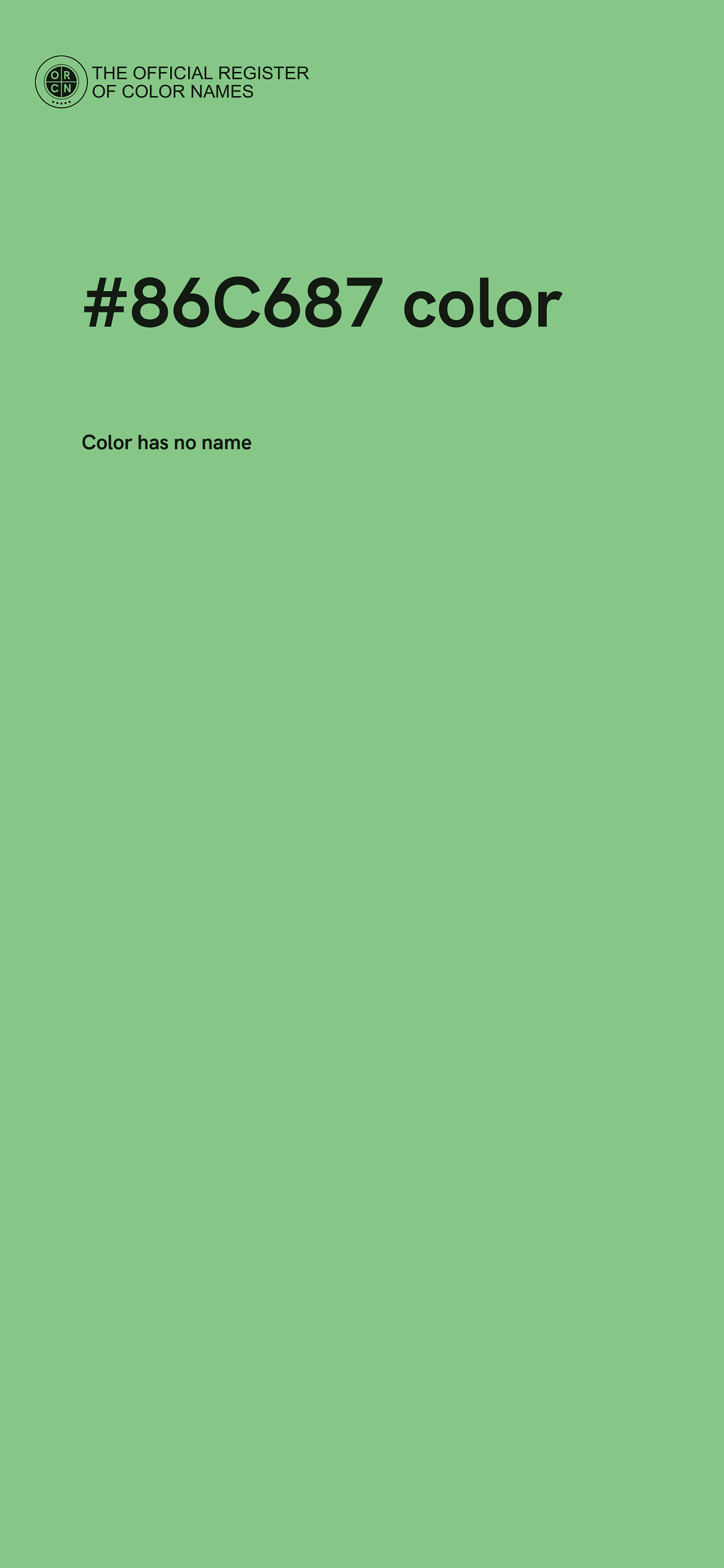 The digital color HEX #86C687 belongs to the Green Color Family featuring Mild Saturation (Saturation Family) and Very Light (Brightness Family).