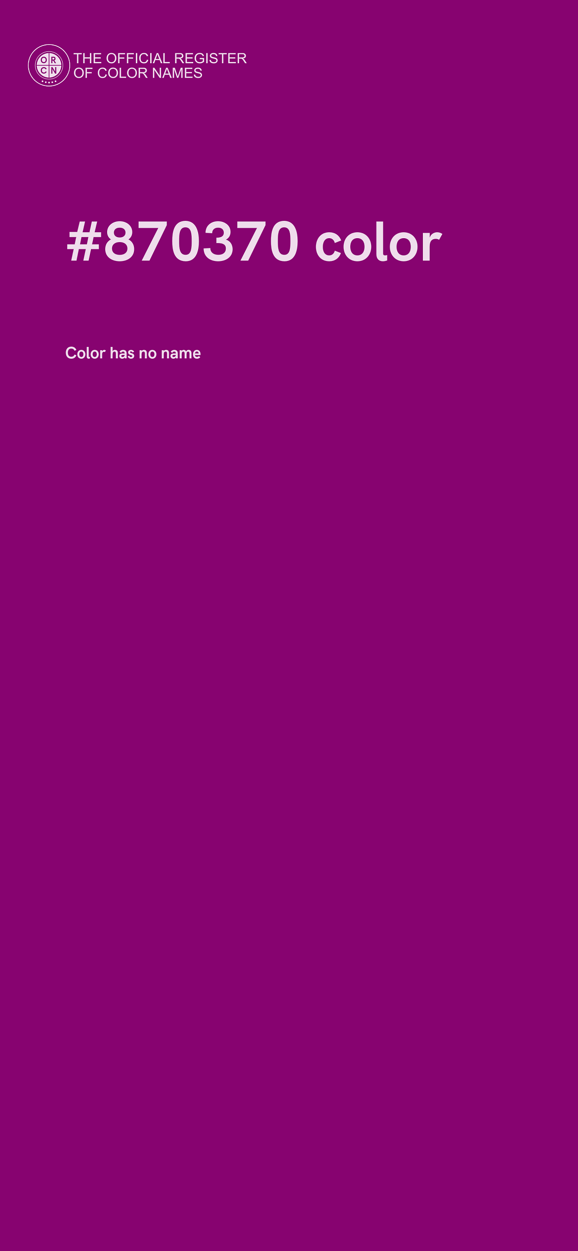 The digital color HEX #870370 belongs to the Magenta Color Family featuring Full Saturation (Saturation Family) and Neutral (Brightness Family).
