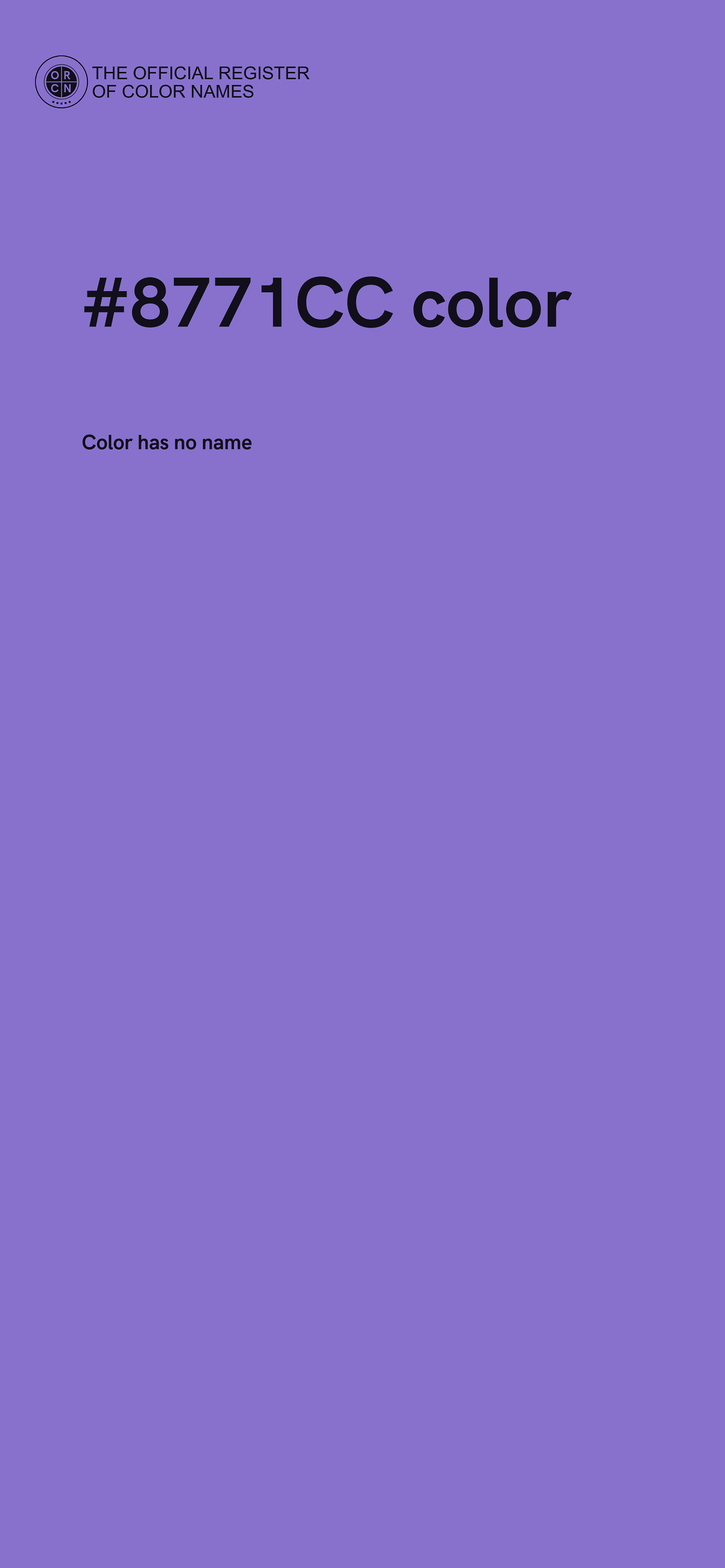 For printing in non digital world, #8771CC is represented in CMYK as 27 Cyan, 36 Magenta, 0 Yellow, and 20 Black (Key) (C:27 M:36 Y:0 K:20).