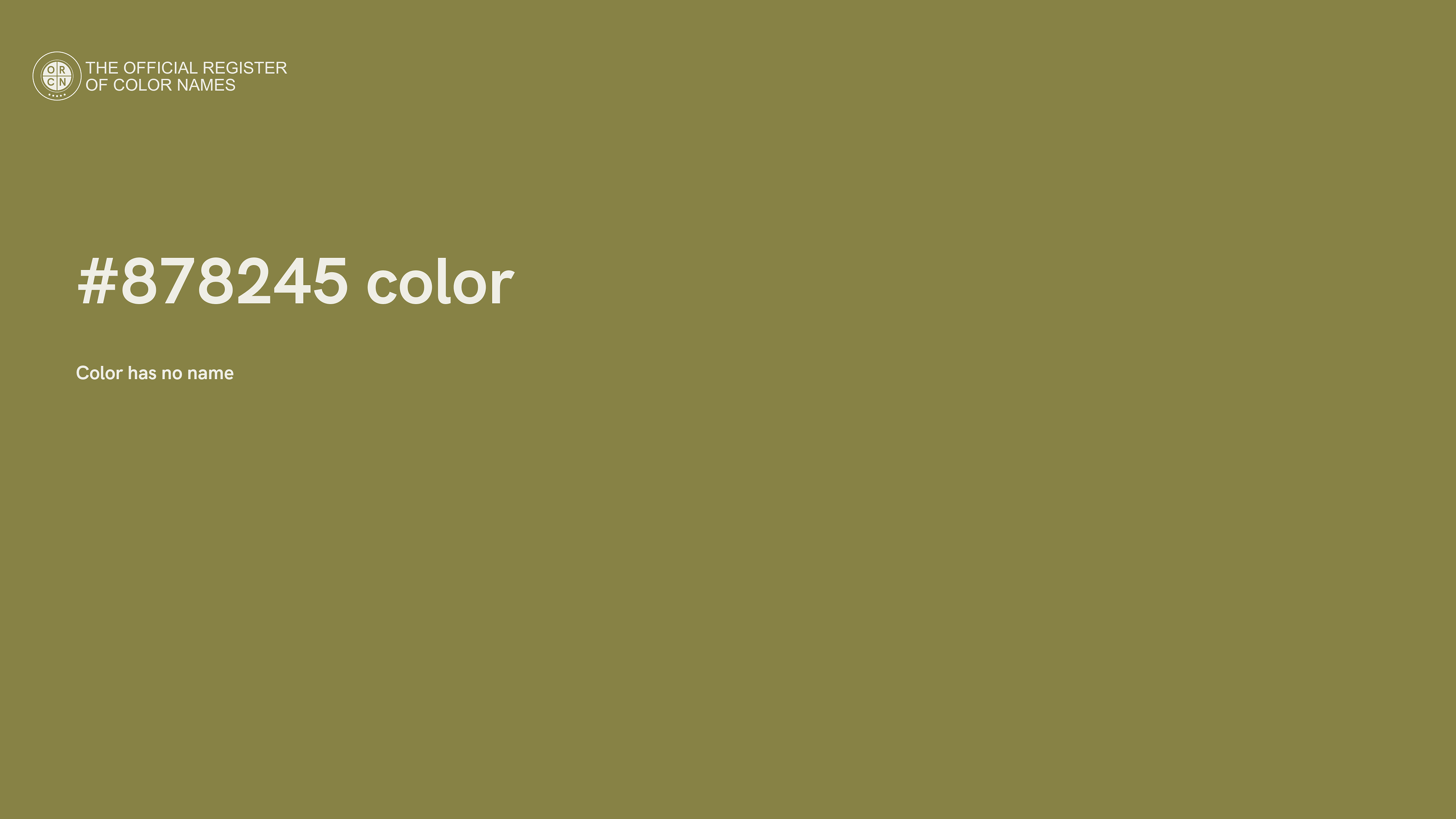The digital color HEX #878245 belongs to the Yellow Color Family featuring Mild Saturation (Saturation Family) and Light (Brightness Family).