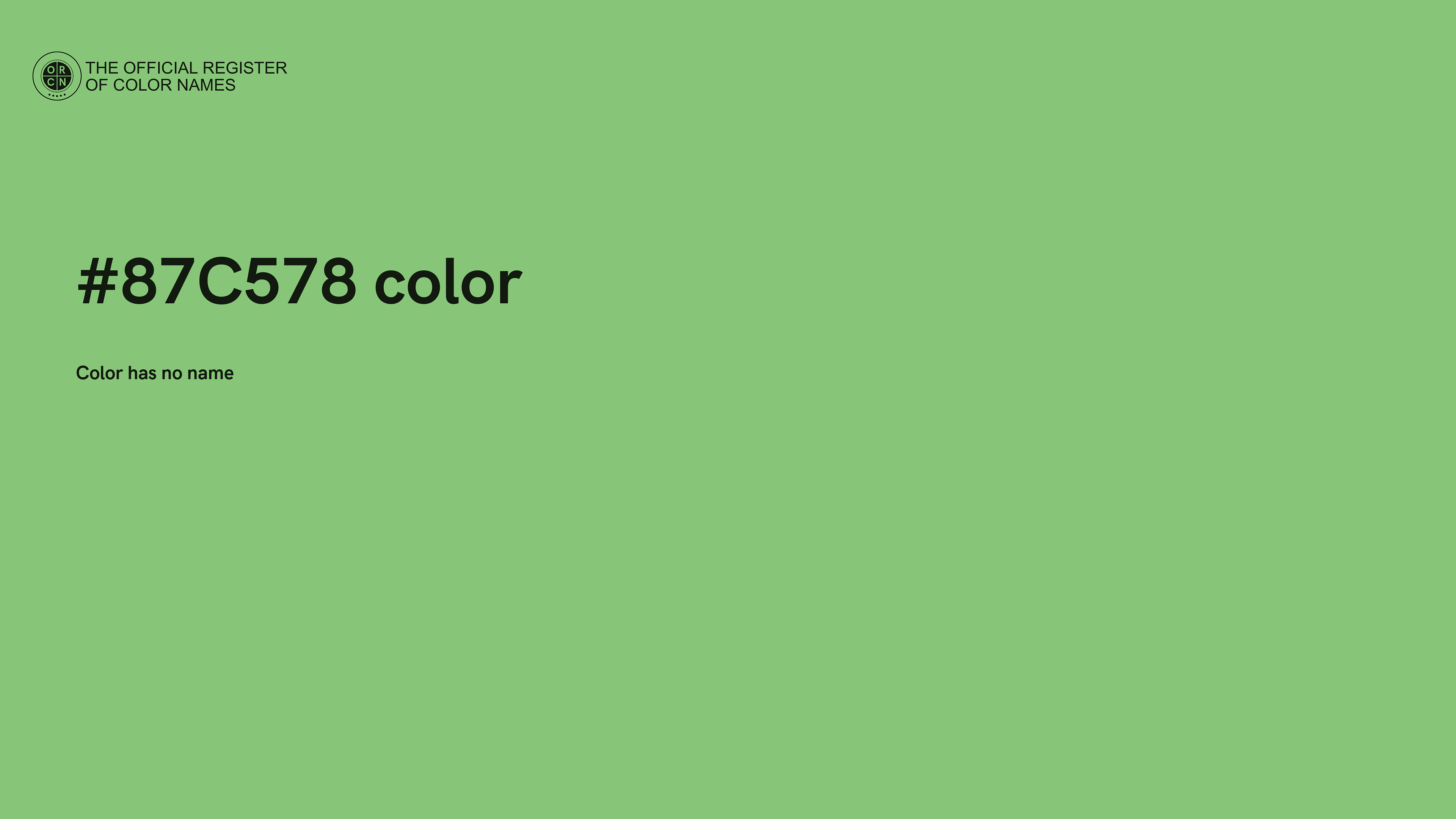 The digital color HEX #87C578 belongs to the Green Color Family featuring Moderate Saturation (Saturation Family) and Very Light (Brightness Family).