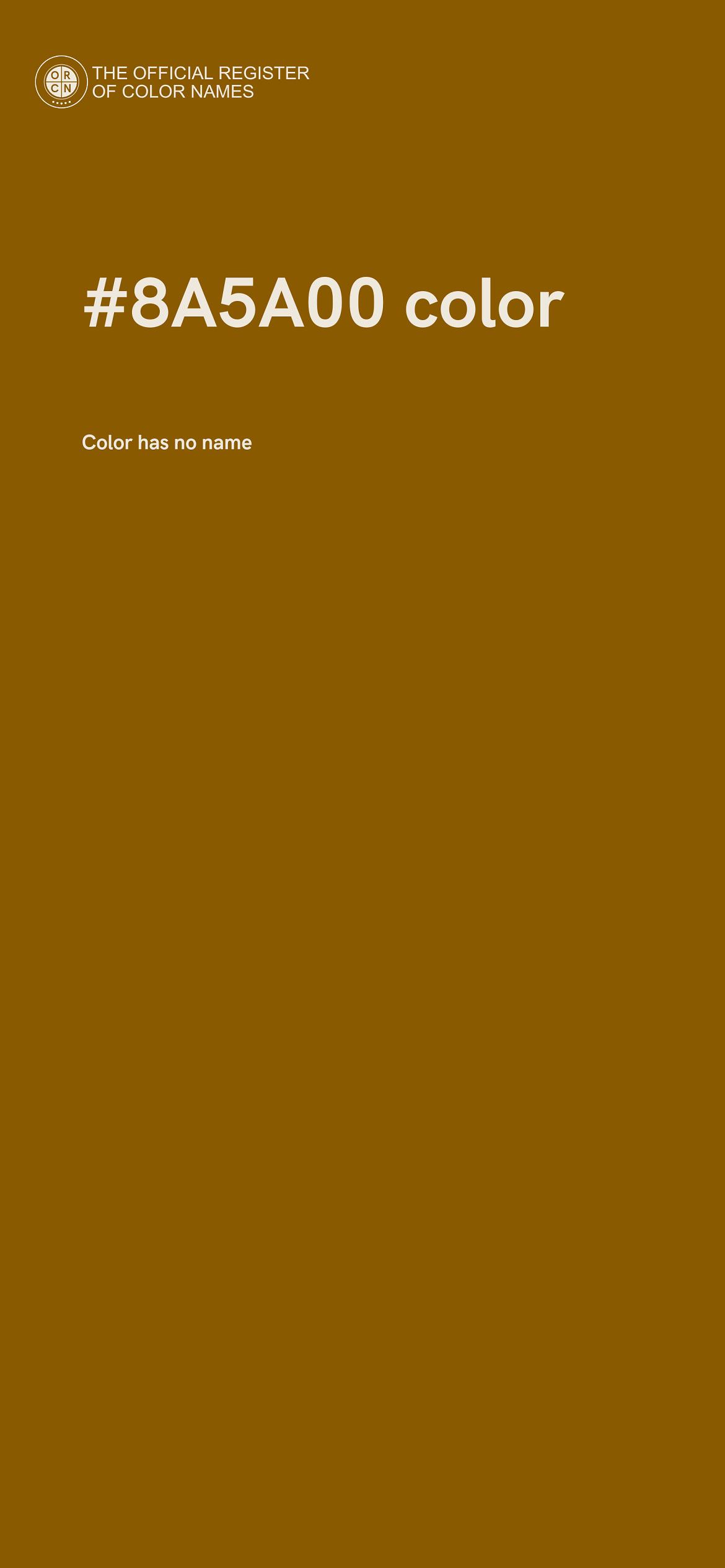 The digital color HEX #8A5A00 belongs to the Orange Color Family featuring Full Saturation (Saturation Family) and Neutral (Brightness Family).