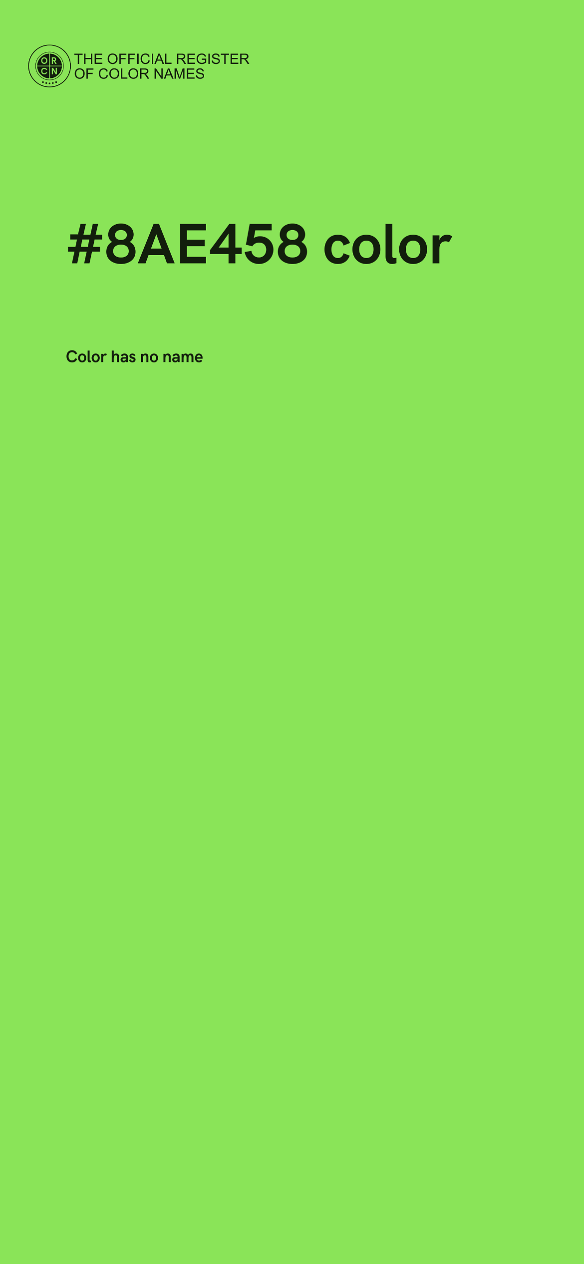 The digital color HEX #8AE458 belongs to the Chartreuse Color Family featuring High Saturation (Saturation Family) and Very Light (Brightness Family).