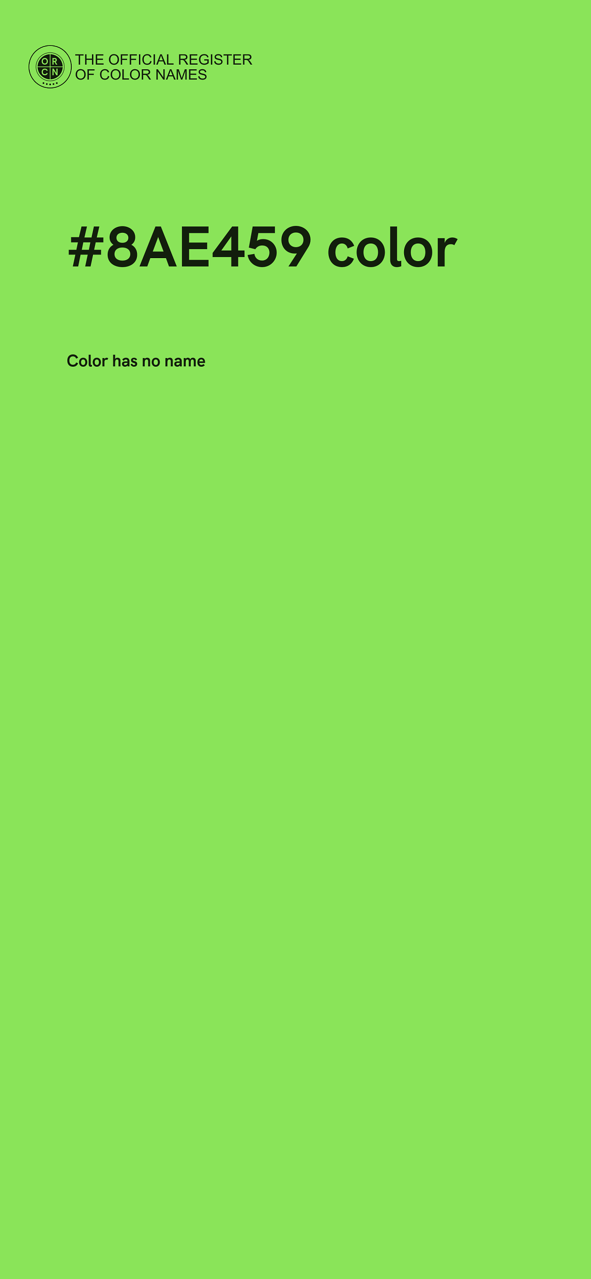The digital color HEX #8AE459 belongs to the Chartreuse Color Family featuring High Saturation (Saturation Family) and Very Light (Brightness Family).