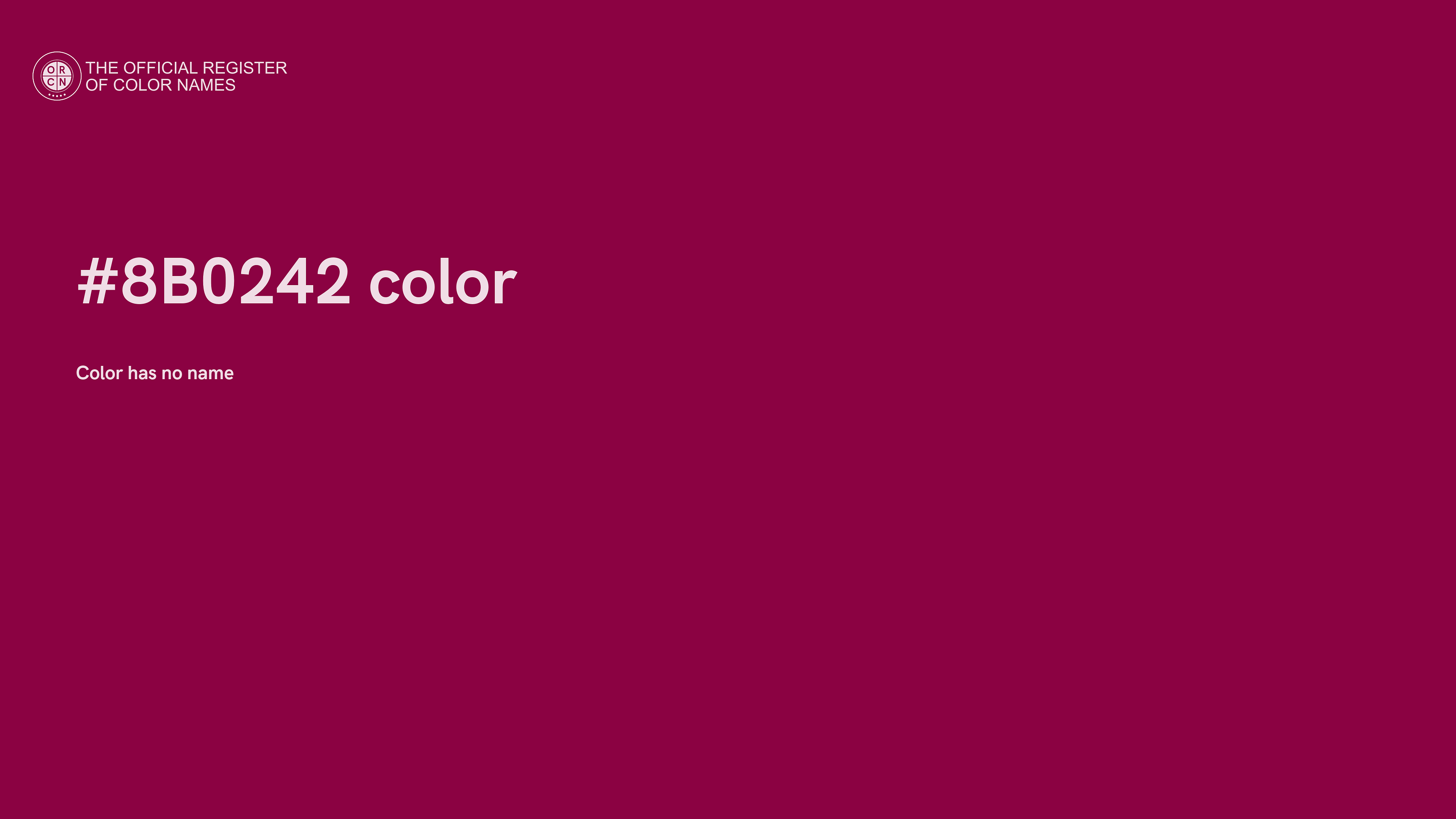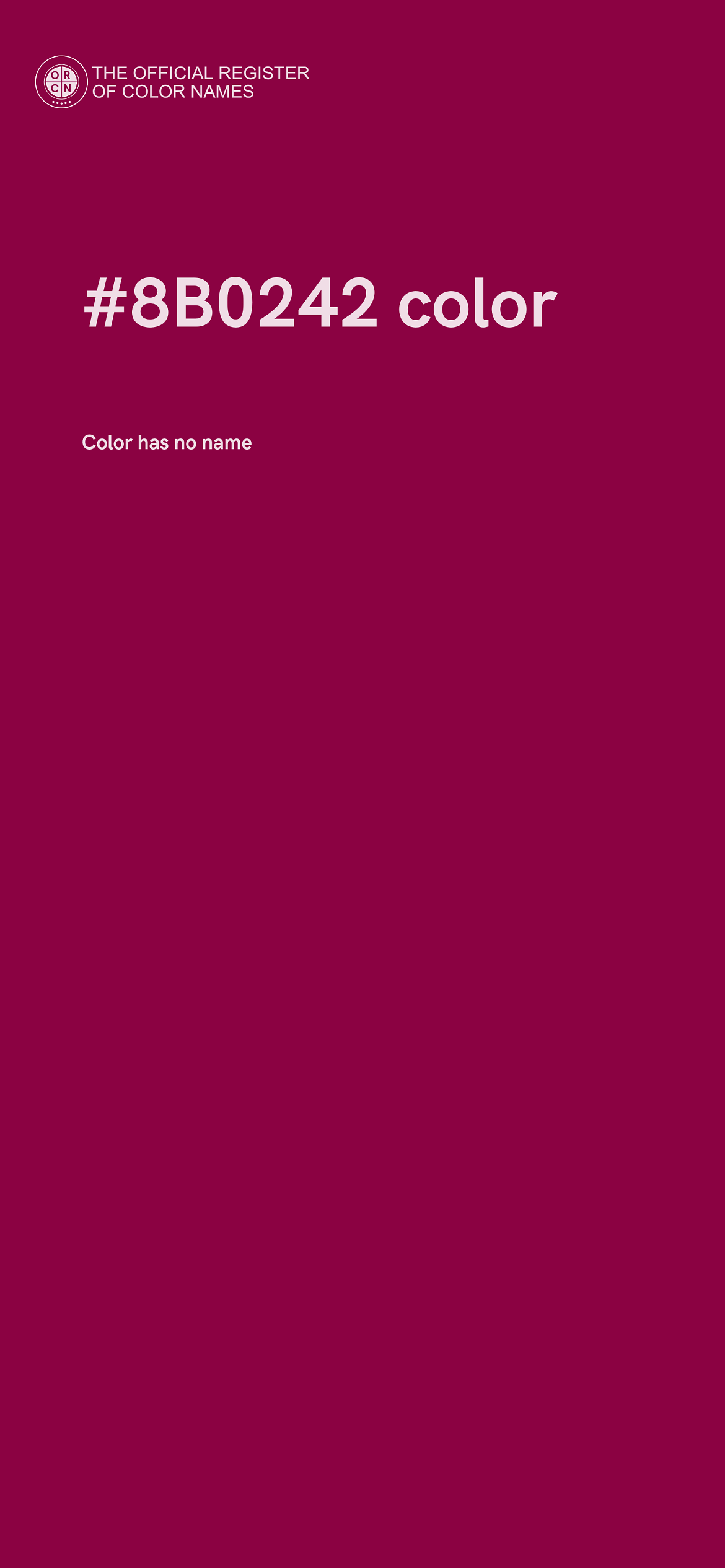 The digital color HEX #8B0242 belongs to the Rose Color Family featuring Full Saturation (Saturation Family) and Neutral (Brightness Family).