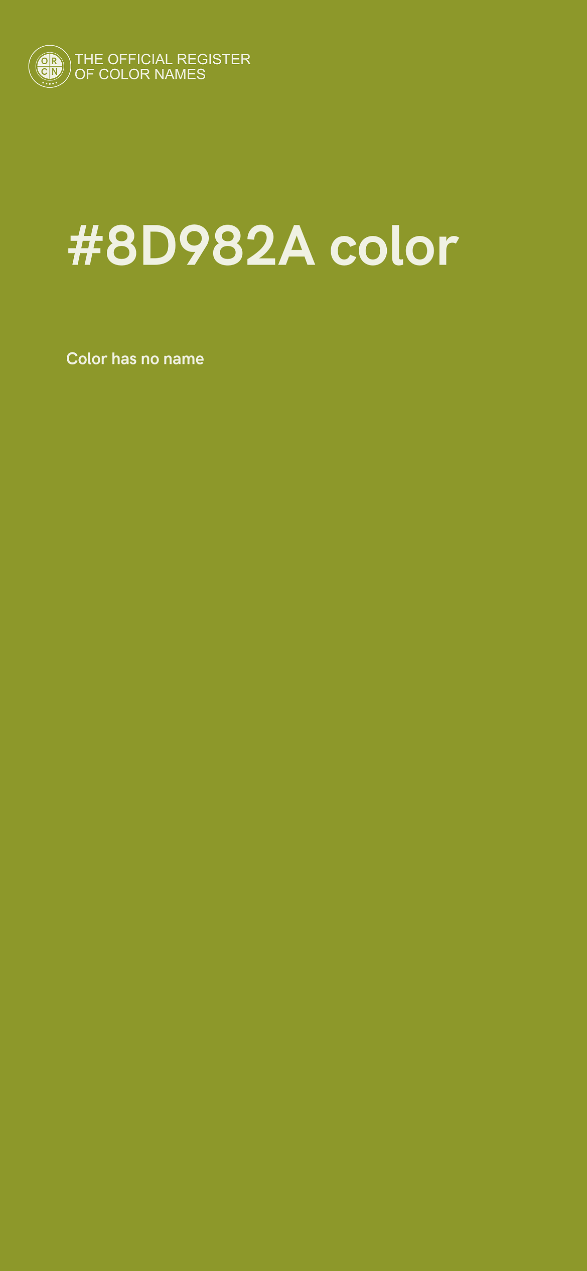 The digital color HEX #8D982A belongs to the Yellow Color Family featuring Moderate Saturation (Saturation Family) and Neutral (Brightness Family).