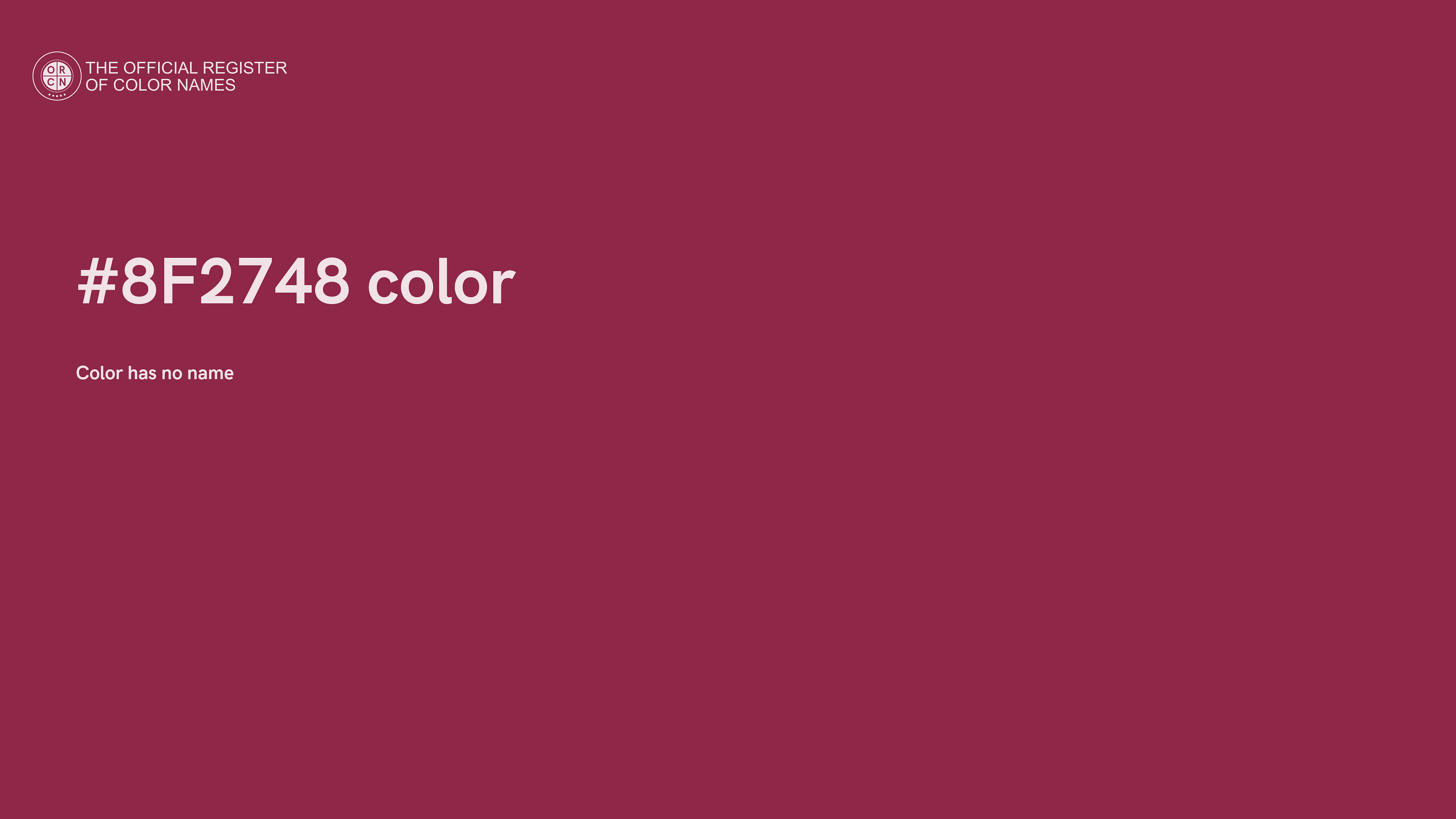 For printing in non digital world, #8F2748 is represented in CMYK as 0 Cyan, 41 Magenta, 28 Yellow, and 44 Black (Key) (C:0 M:41 Y:28 K:44).