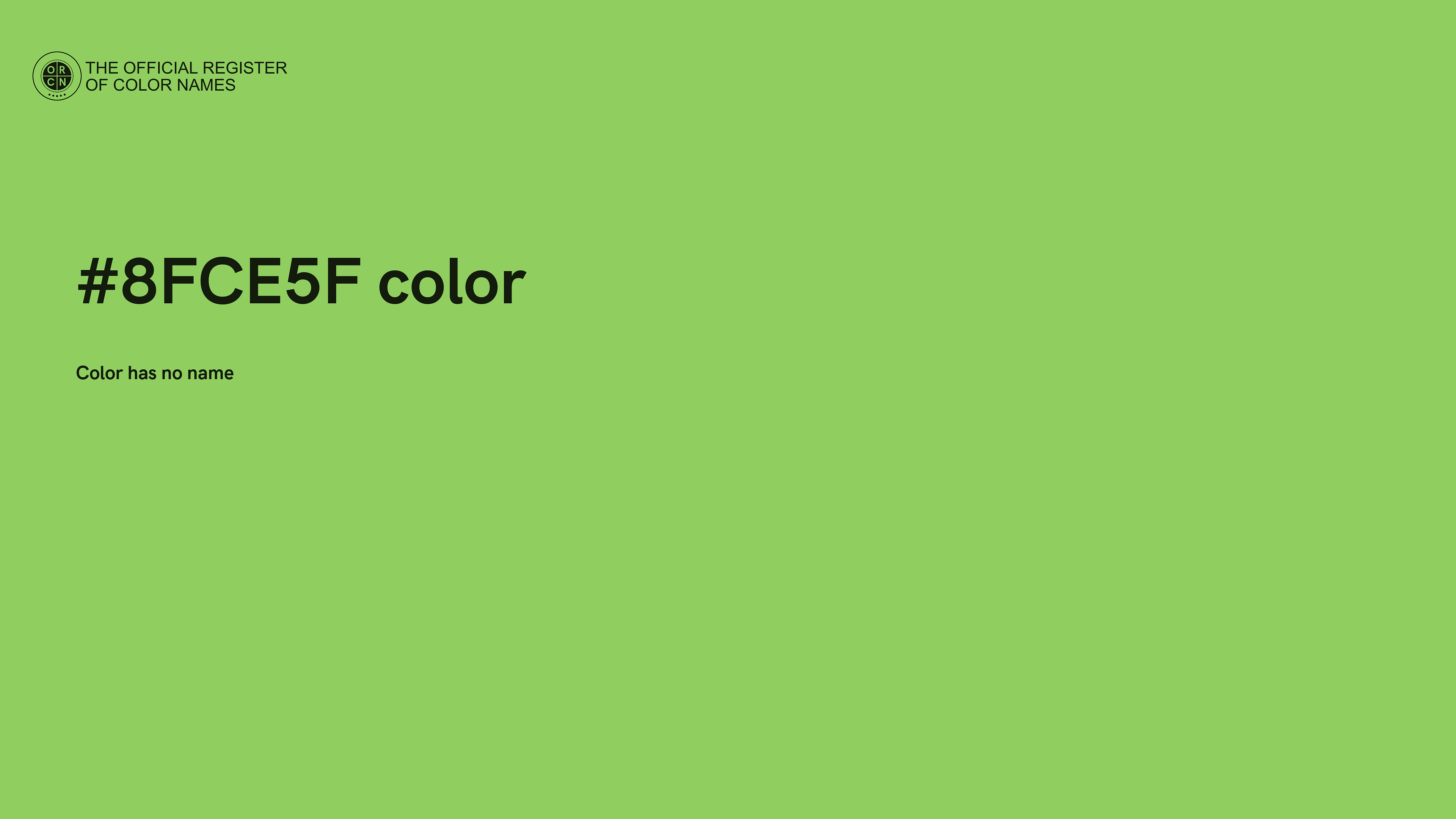 The digital color HEX #8FCE5F belongs to the Chartreuse Color Family featuring Moderate Saturation (Saturation Family) and Light (Brightness Family).