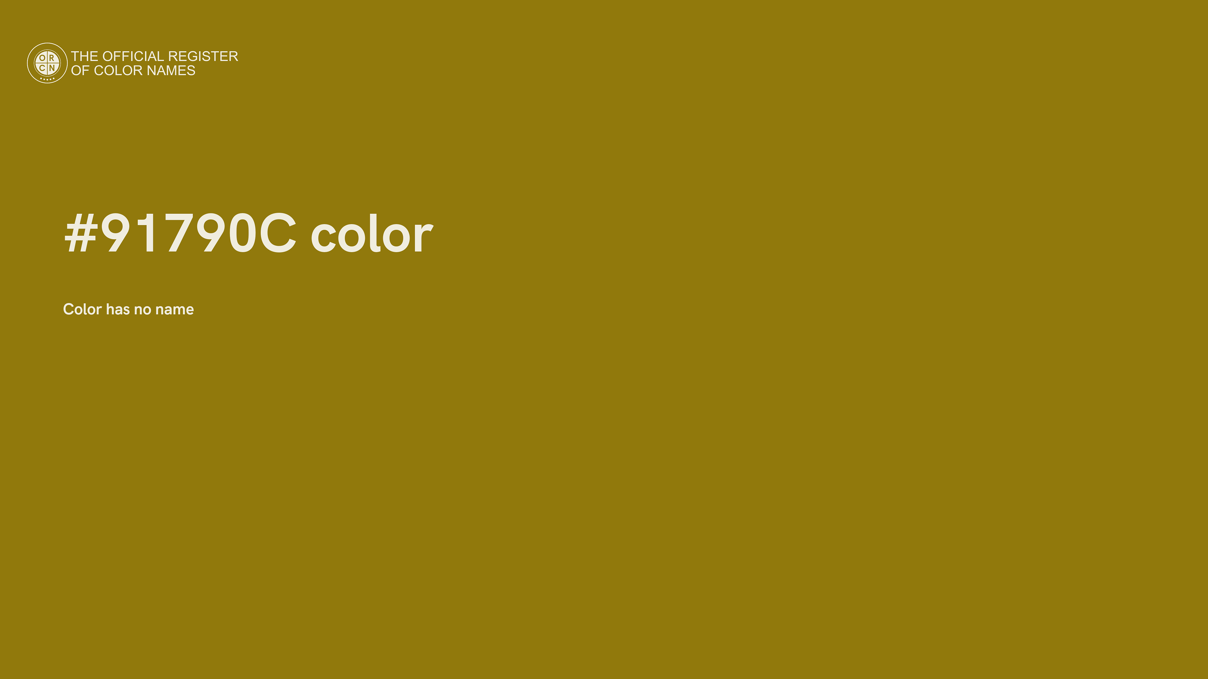 The digital color HEX #91790C belongs to the Yellow Color Family featuring Full Saturation (Saturation Family) and Neutral (Brightness Family).
