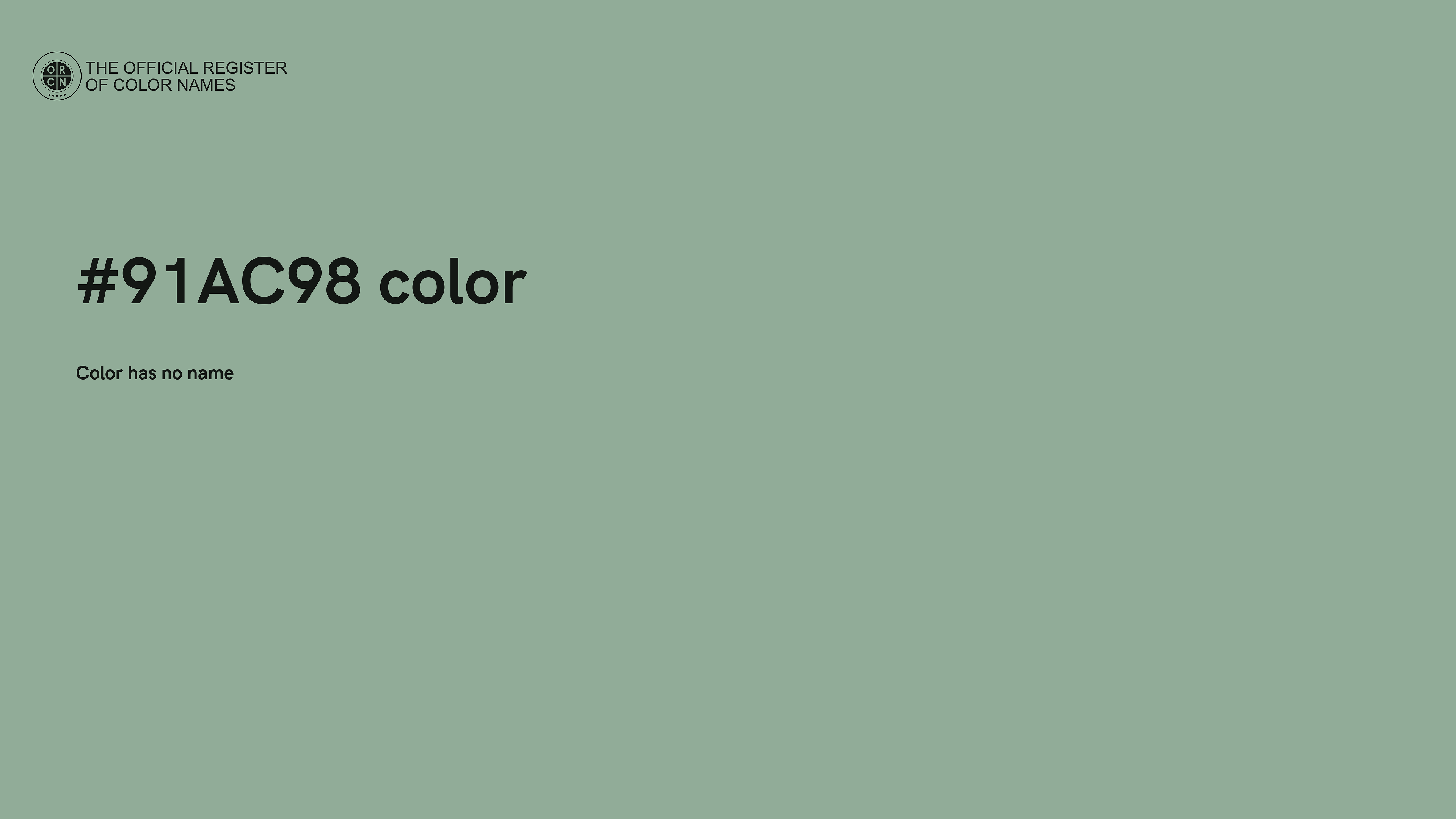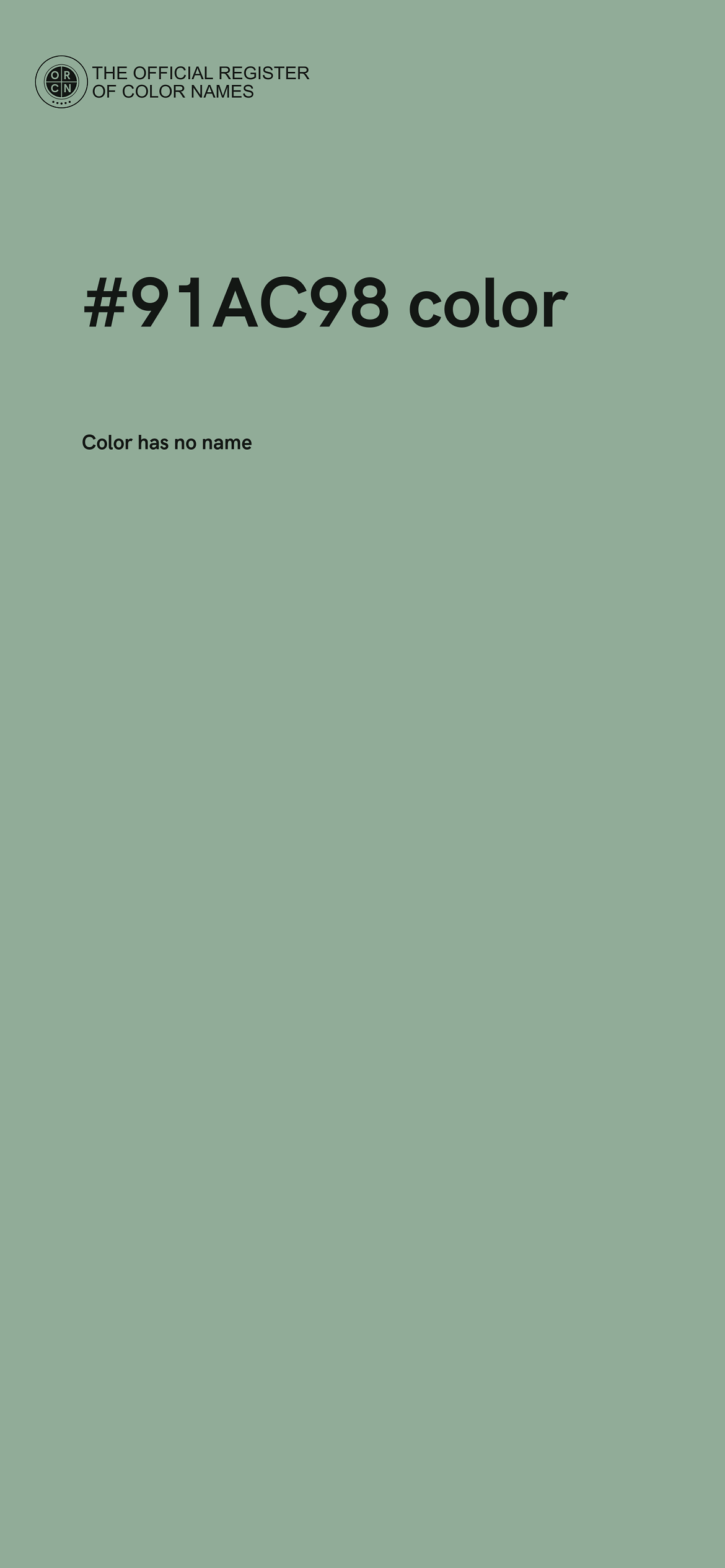 The digital color HEX #91AC98 belongs to the Spring Green Color Family featuring Low Saturation (Saturation Family) and Very Light (Brightness Family).