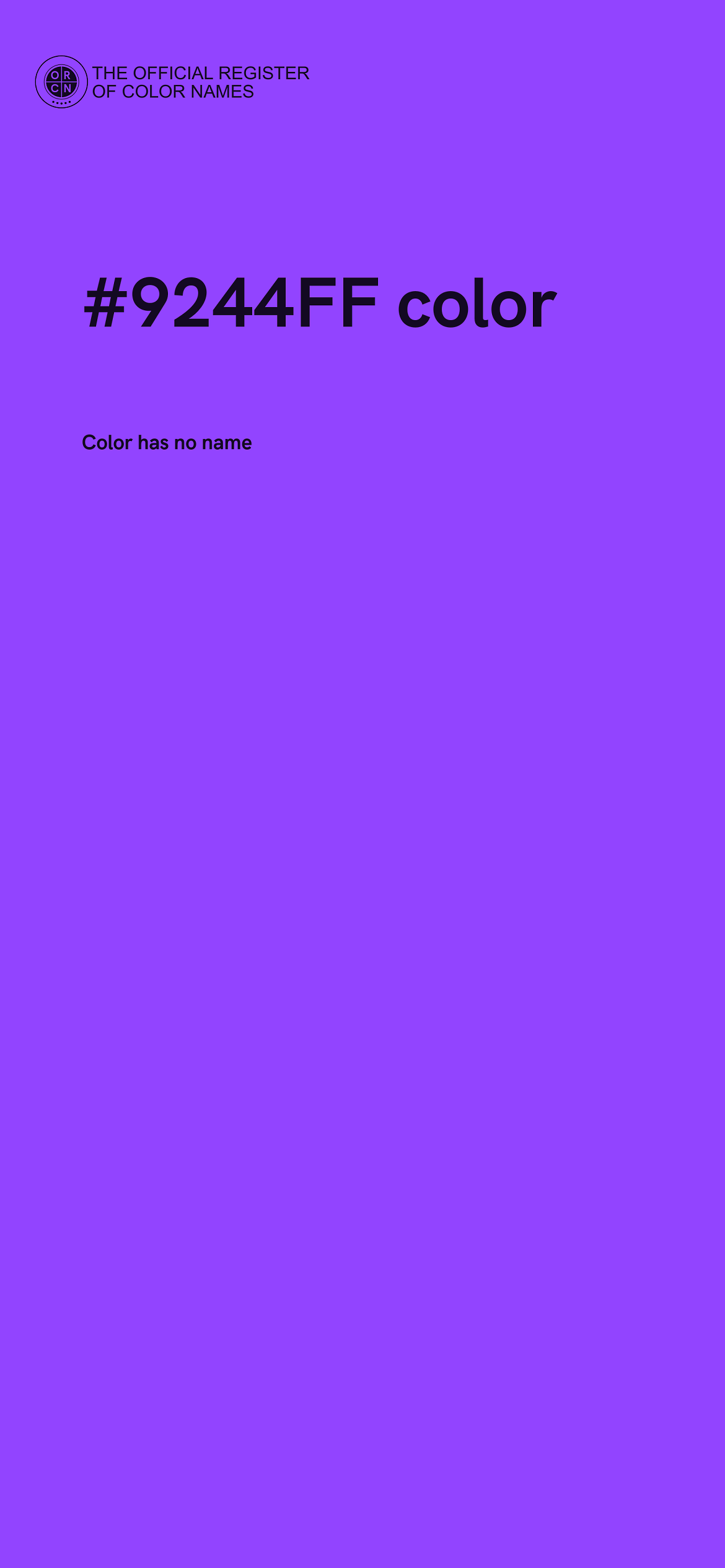 The digital color HEX #9244FF belongs to the Violet Color Family featuring Full Saturation (Saturation Family) and Very Light (Brightness Family).