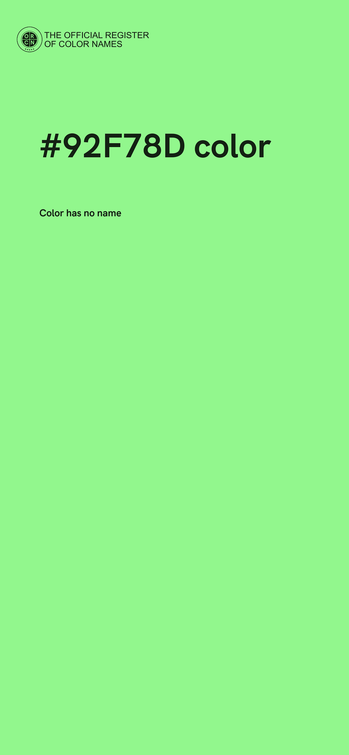 The digital color HEX #92F78D belongs to the Green Color Family featuring Full Saturation (Saturation Family) and Very Light (Brightness Family).