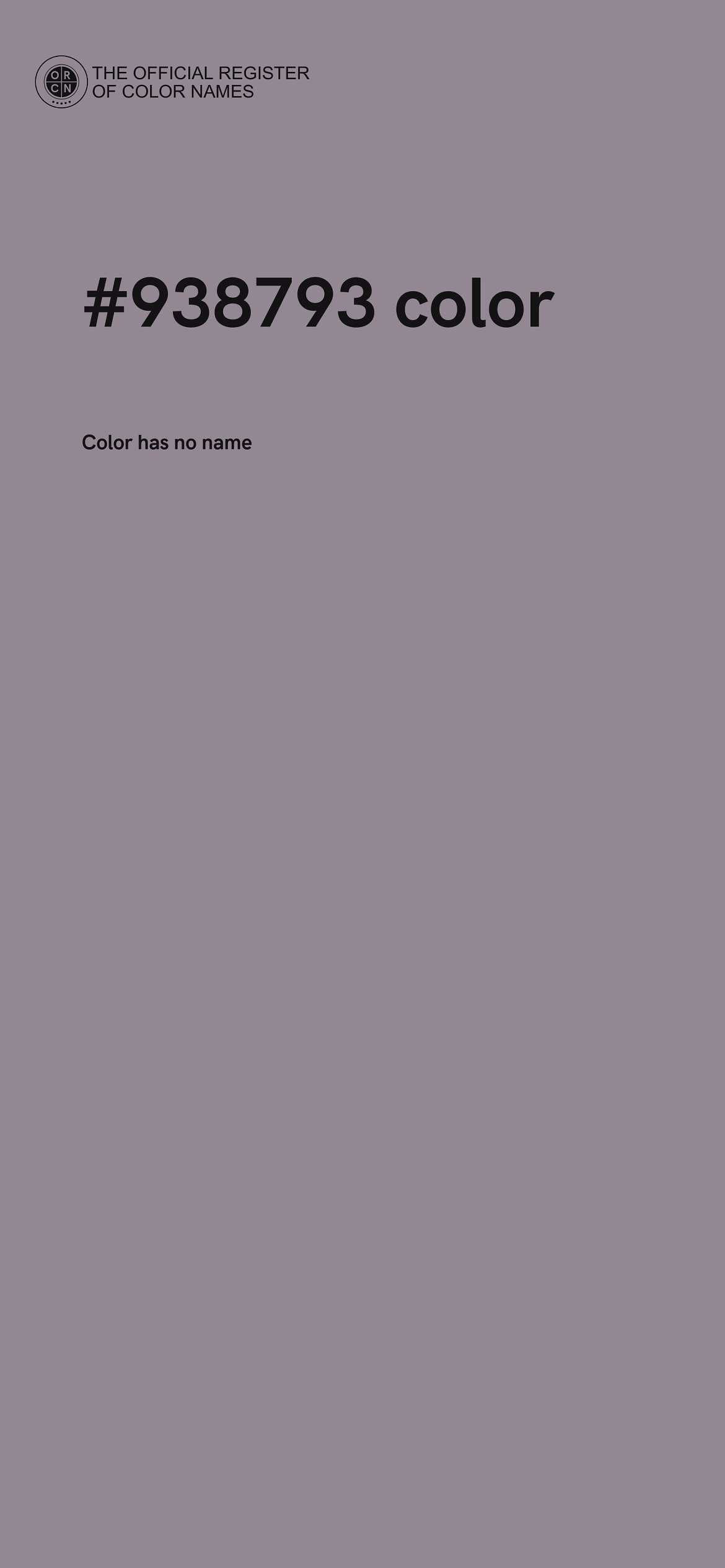 For printing in non digital world, #938793 is represented in CMYK as 0 Cyan, 5 Magenta, 0 Yellow, and 42 Black (Key) (C:0 M:5 Y:0 K:42).