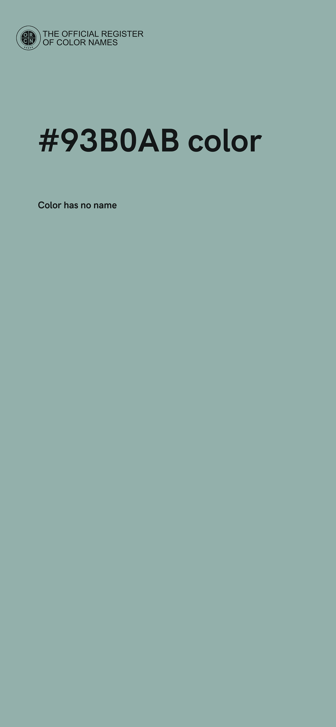The digital color HEX #93B0AB belongs to the Cyan Color Family featuring Low Saturation (Saturation Family) and Very Light (Brightness Family).