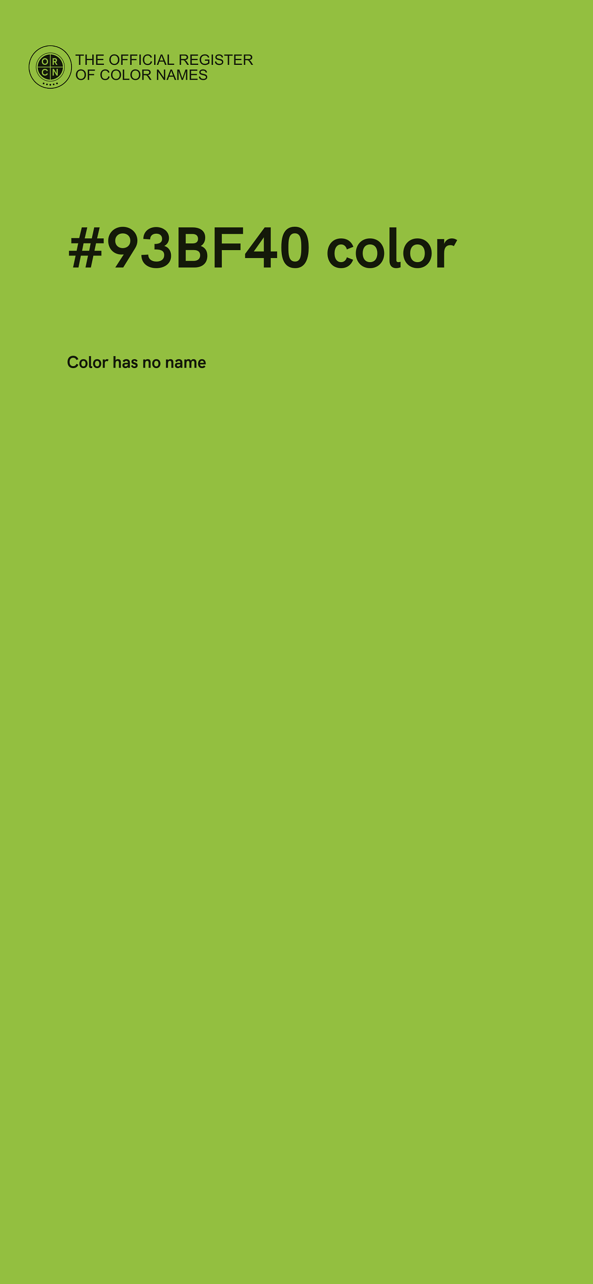The digital color HEX #93BF40 belongs to the Chartreuse Color Family featuring Moderate Saturation (Saturation Family) and Light (Brightness Family).