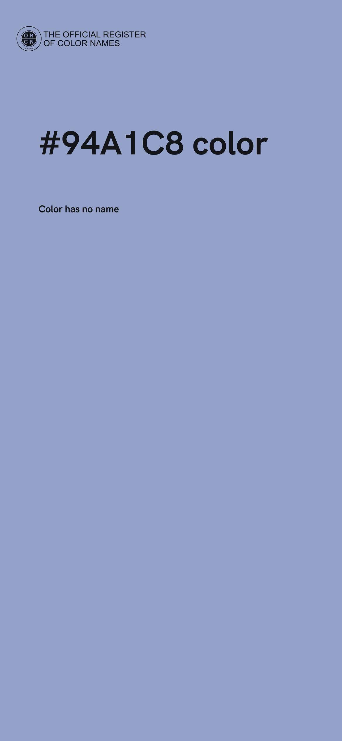 The digital color HEX #94A1C8 belongs to the Blue Color Family featuring Mild Saturation (Saturation Family) and Very Light (Brightness Family).
