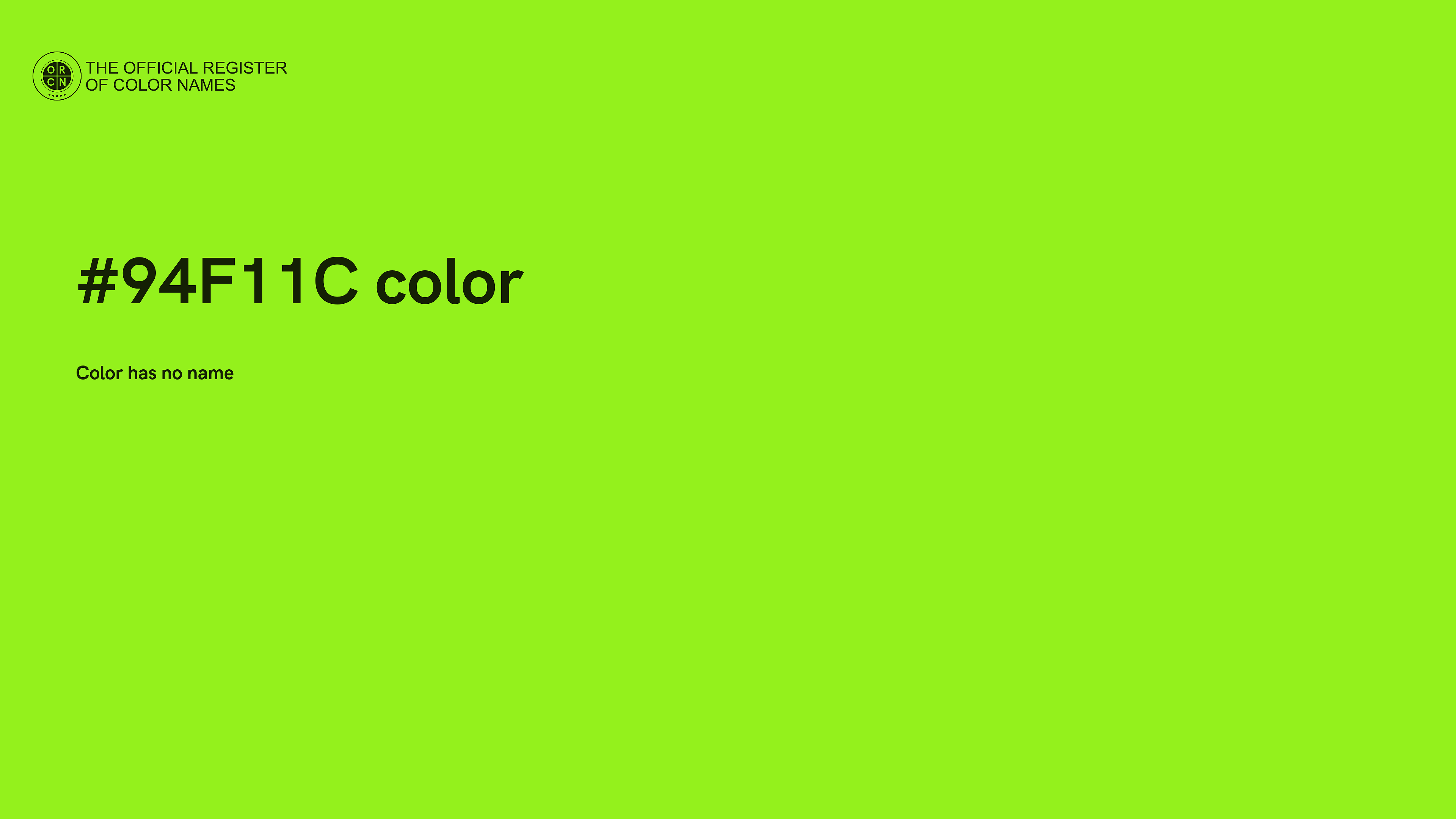 The digital color HEX #94F11C belongs to the Chartreuse Color Family featuring Full Saturation (Saturation Family) and Light (Brightness Family).