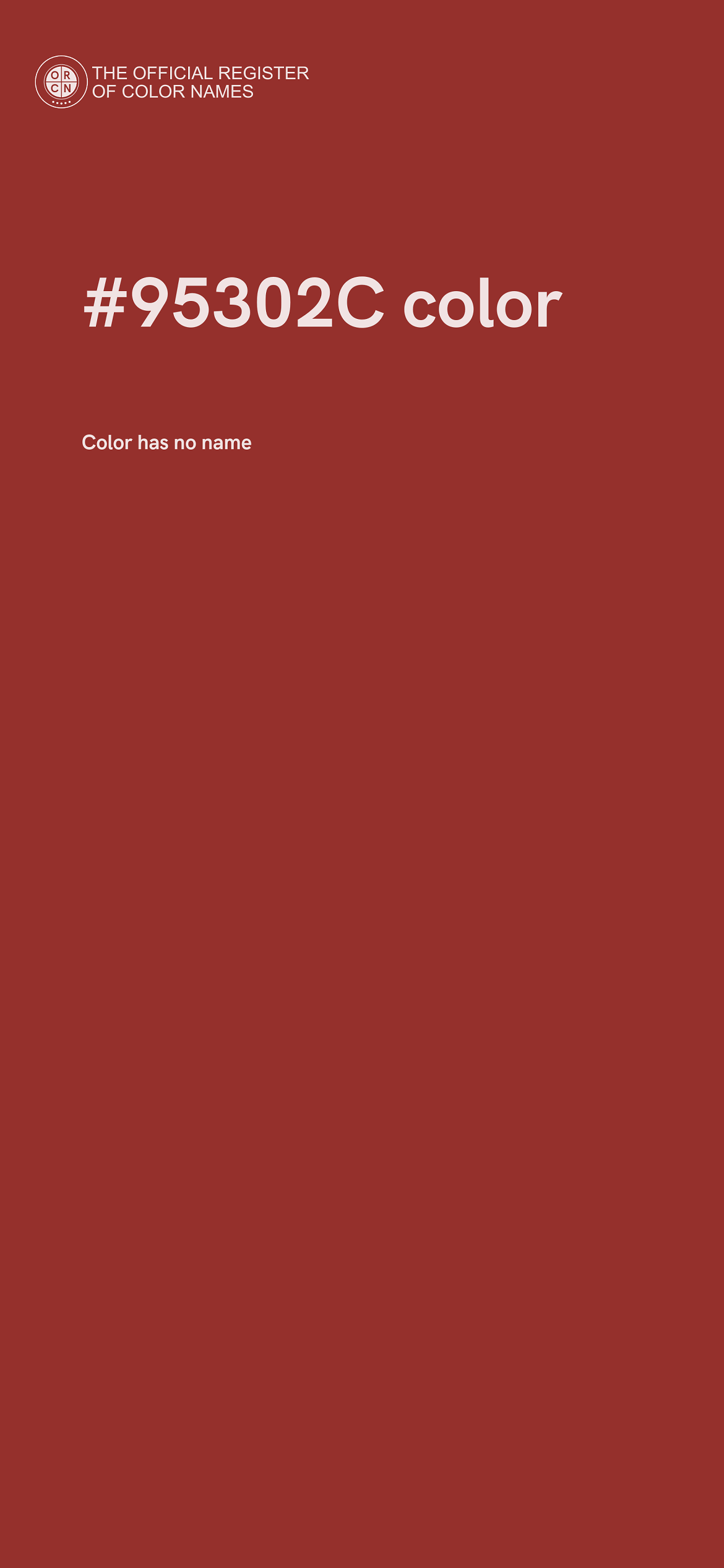 The digital color HEX #95302C belongs to the Red Color Family featuring Moderate Saturation (Saturation Family) and Neutral (Brightness Family).