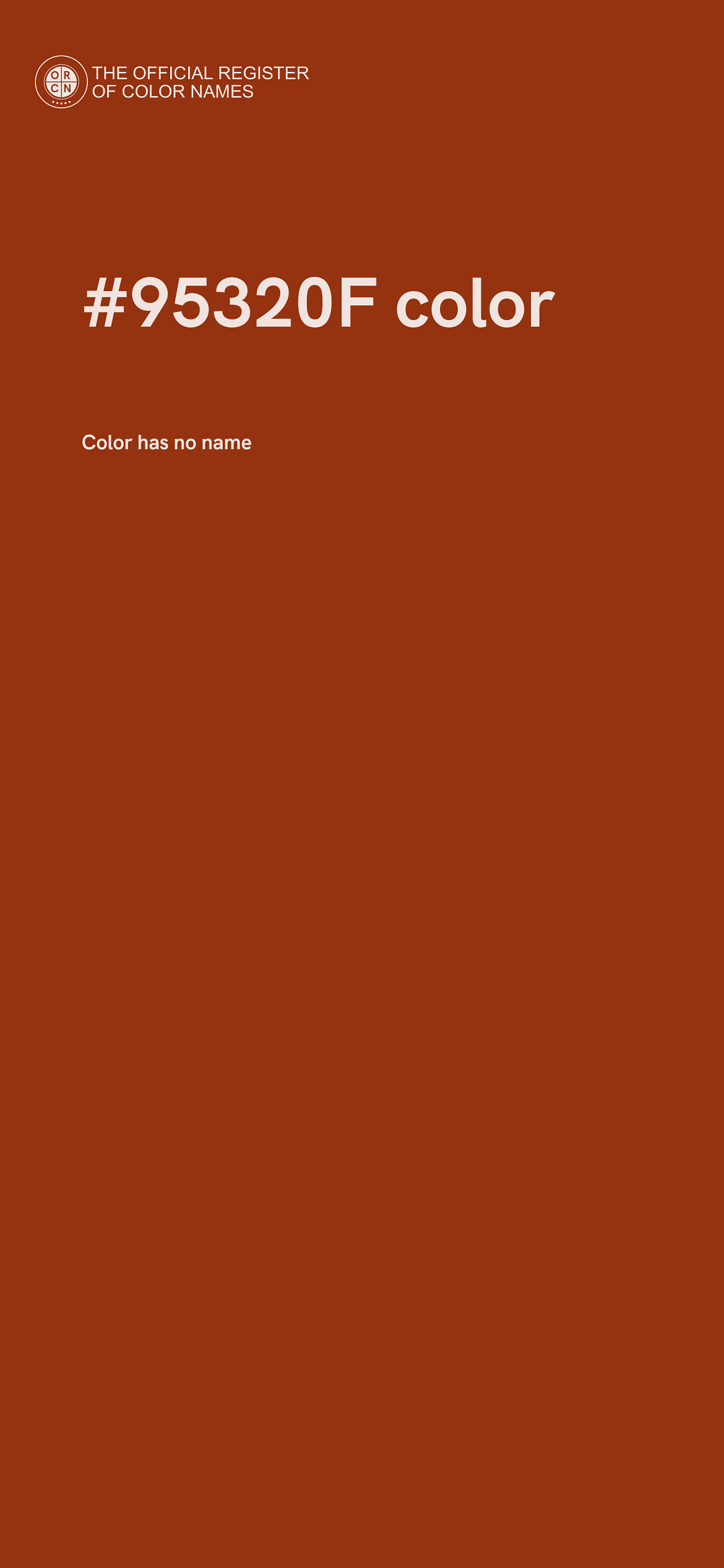 The digital color HEX #95320F belongs to the Orange Color Family featuring High Saturation (Saturation Family) and Neutral (Brightness Family).