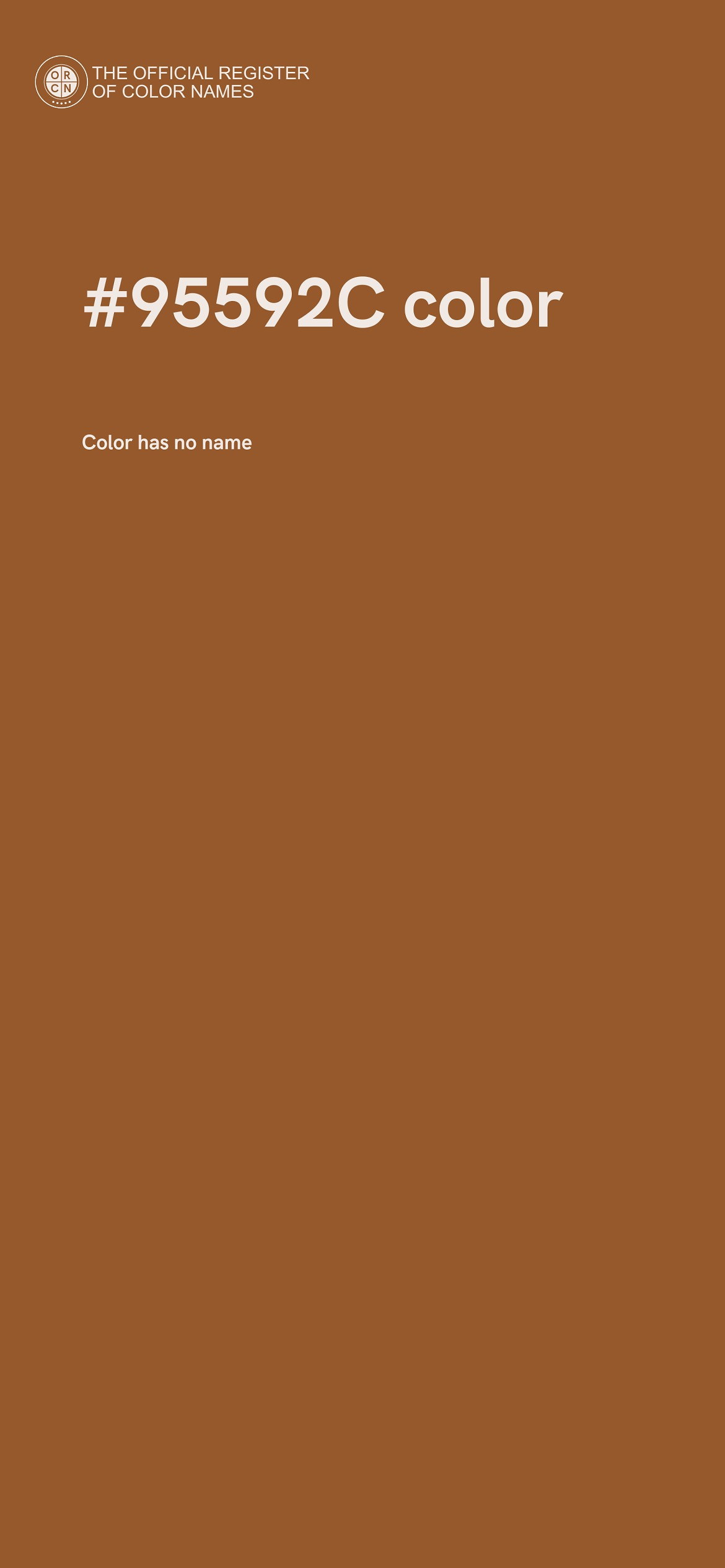 The digital color HEX #95592C belongs to the Orange Color Family featuring Moderate Saturation (Saturation Family) and Neutral (Brightness Family).