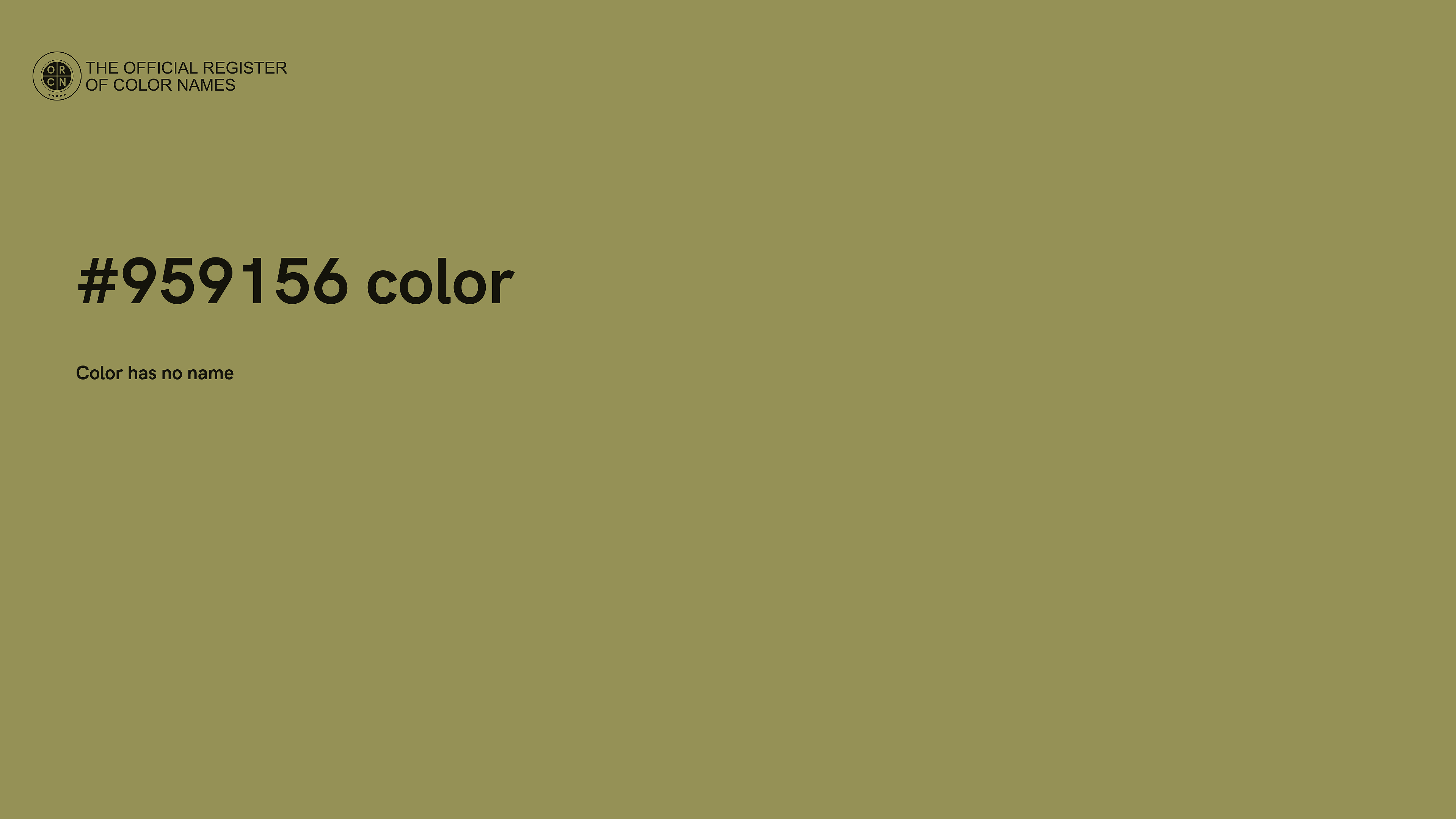 The digital color HEX #959156 belongs to the Yellow Color Family featuring Mild Saturation (Saturation Family) and Light (Brightness Family).