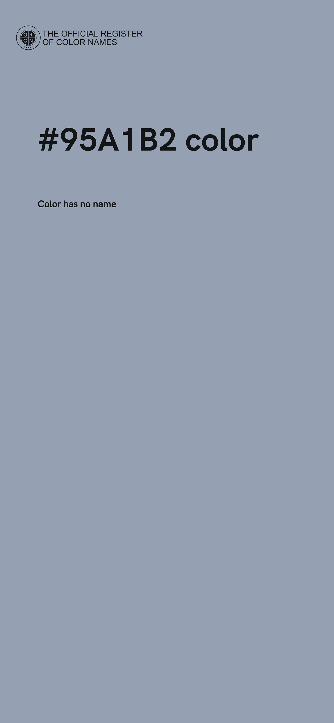 The digital color HEX #95A1B2 belongs to the Azure Color Family featuring Low Saturation (Saturation Family) and Very Light (Brightness Family).