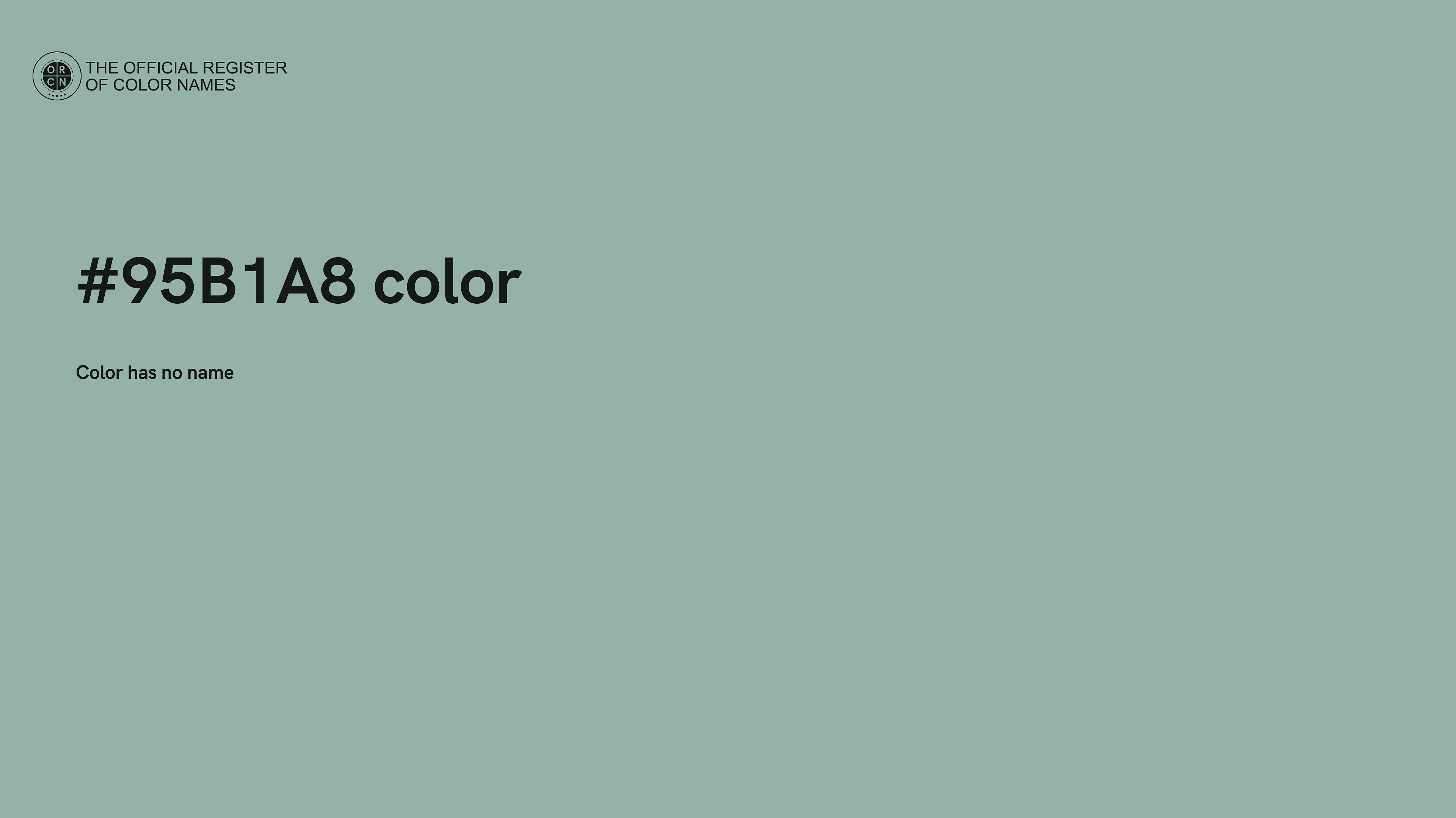 The digital color HEX #95B1A8 belongs to the Spring Green Color Family featuring Low Saturation (Saturation Family) and Very Light (Brightness Family).