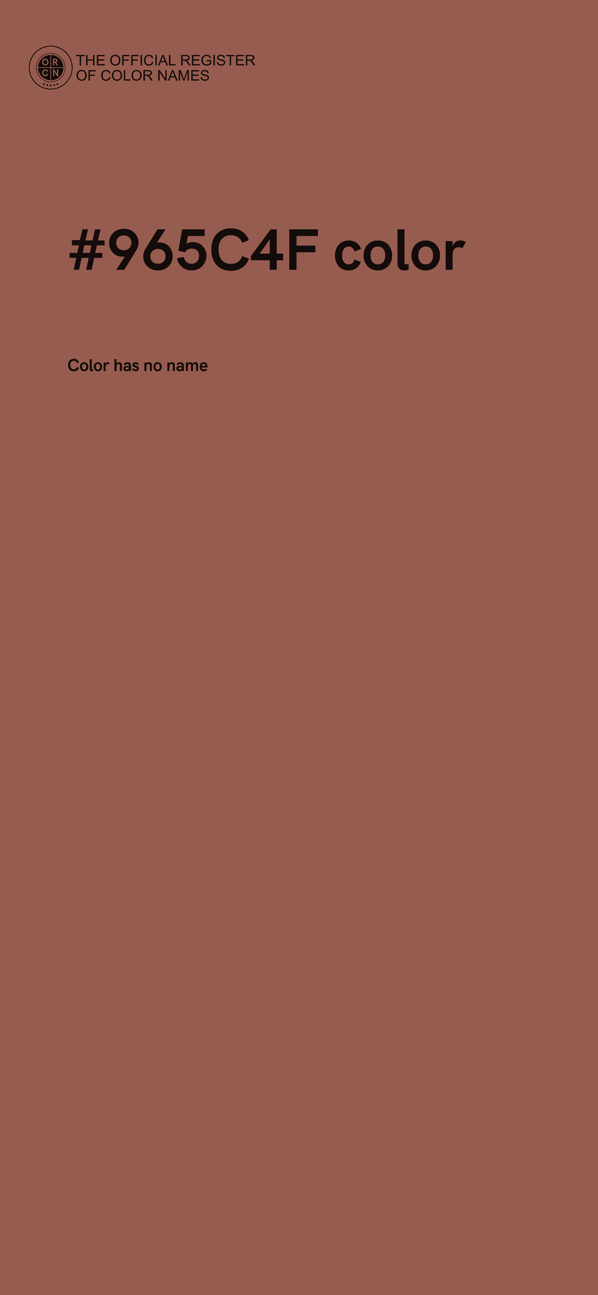 The digital color HEX #965C4F belongs to the Red Color Family featuring Mild Saturation (Saturation Family) and Light (Brightness Family).