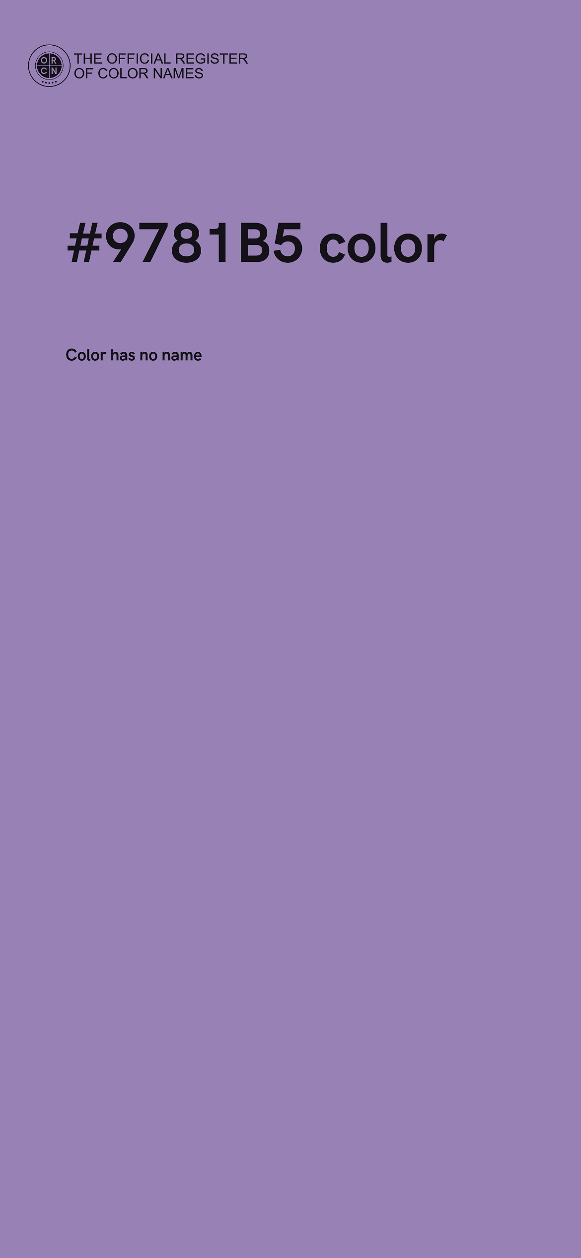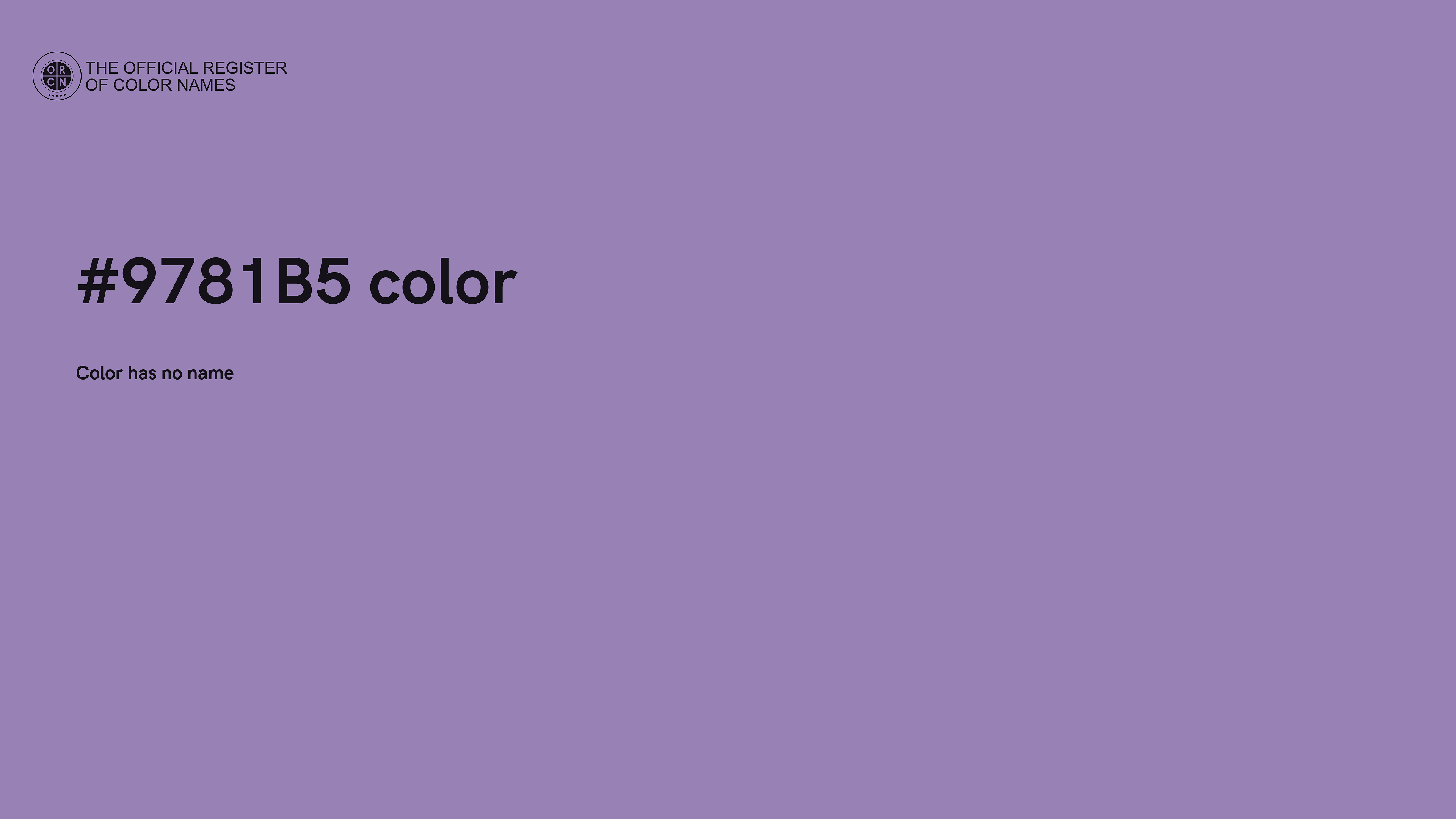 HEX code #9781B5 represent the color in hexadecimal format by combining three values – the amounts of Red, Green and Blue (RGB). Its RGB composition is 151, 129, 181 ( rgb(151, 129, 181) ), which breaks down into 59.2% of Red, 50.6% Green and 71% Blue.
