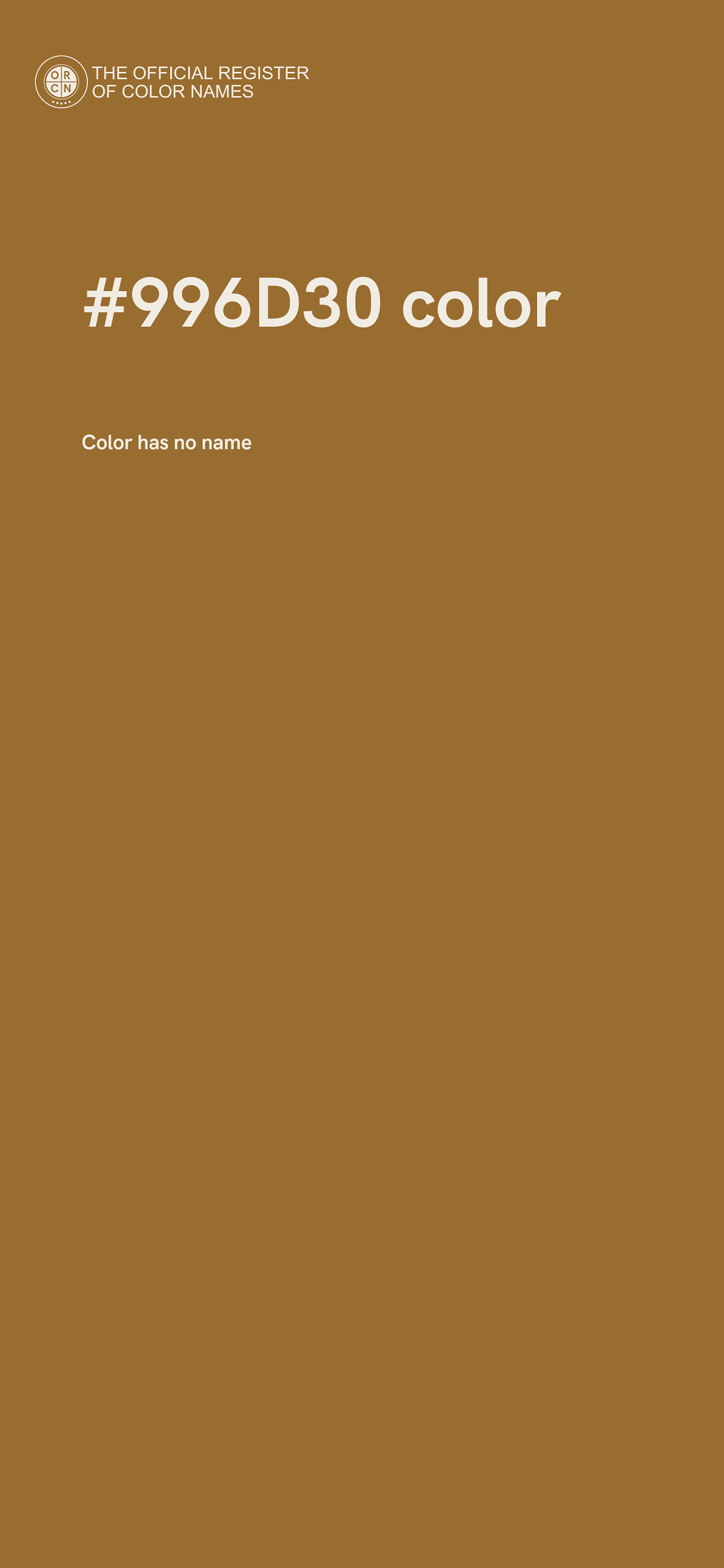The digital color HEX #996D30 belongs to the Orange Color Family featuring Moderate Saturation (Saturation Family) and Neutral (Brightness Family).