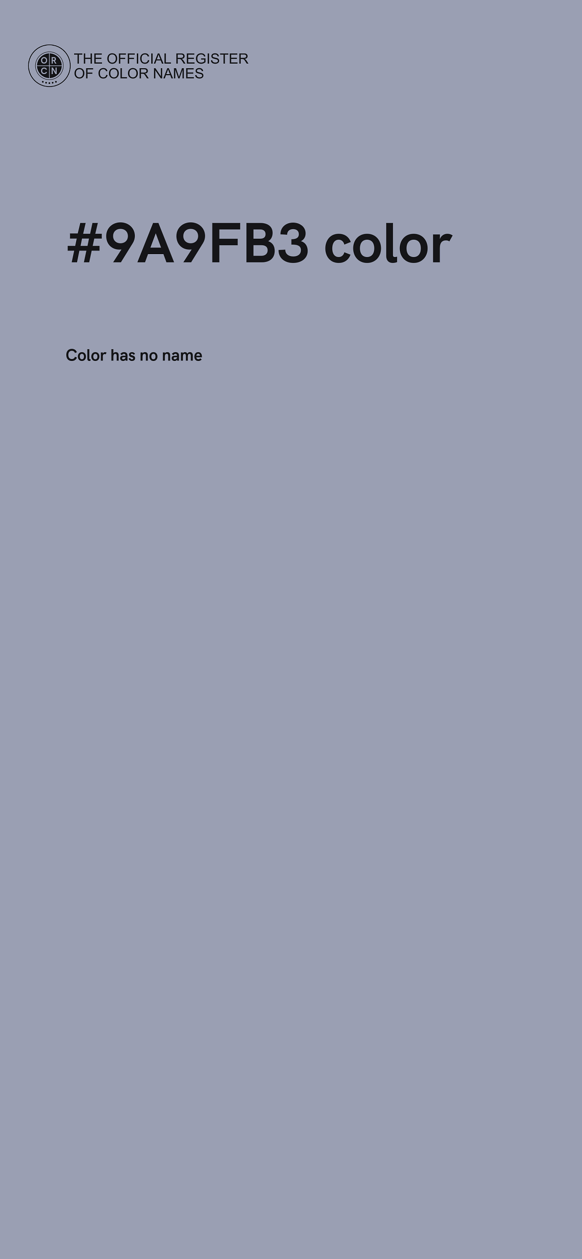 The digital color HEX #9A9FB3 belongs to the Blue Color Family featuring Low Saturation (Saturation Family) and Very Light (Brightness Family).