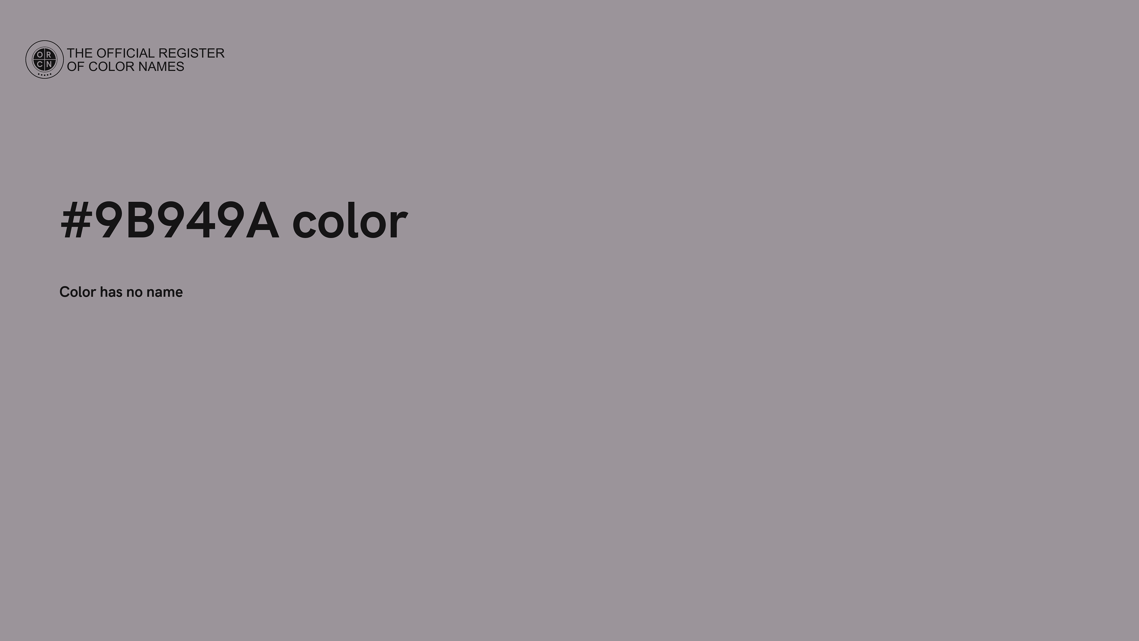 For printing in non digital world, #9B949A is represented in CMYK as 0 Cyan, 3 Magenta, 0 Yellow, and 39 Black (Key) (C:0 M:3 Y:0 K:39).