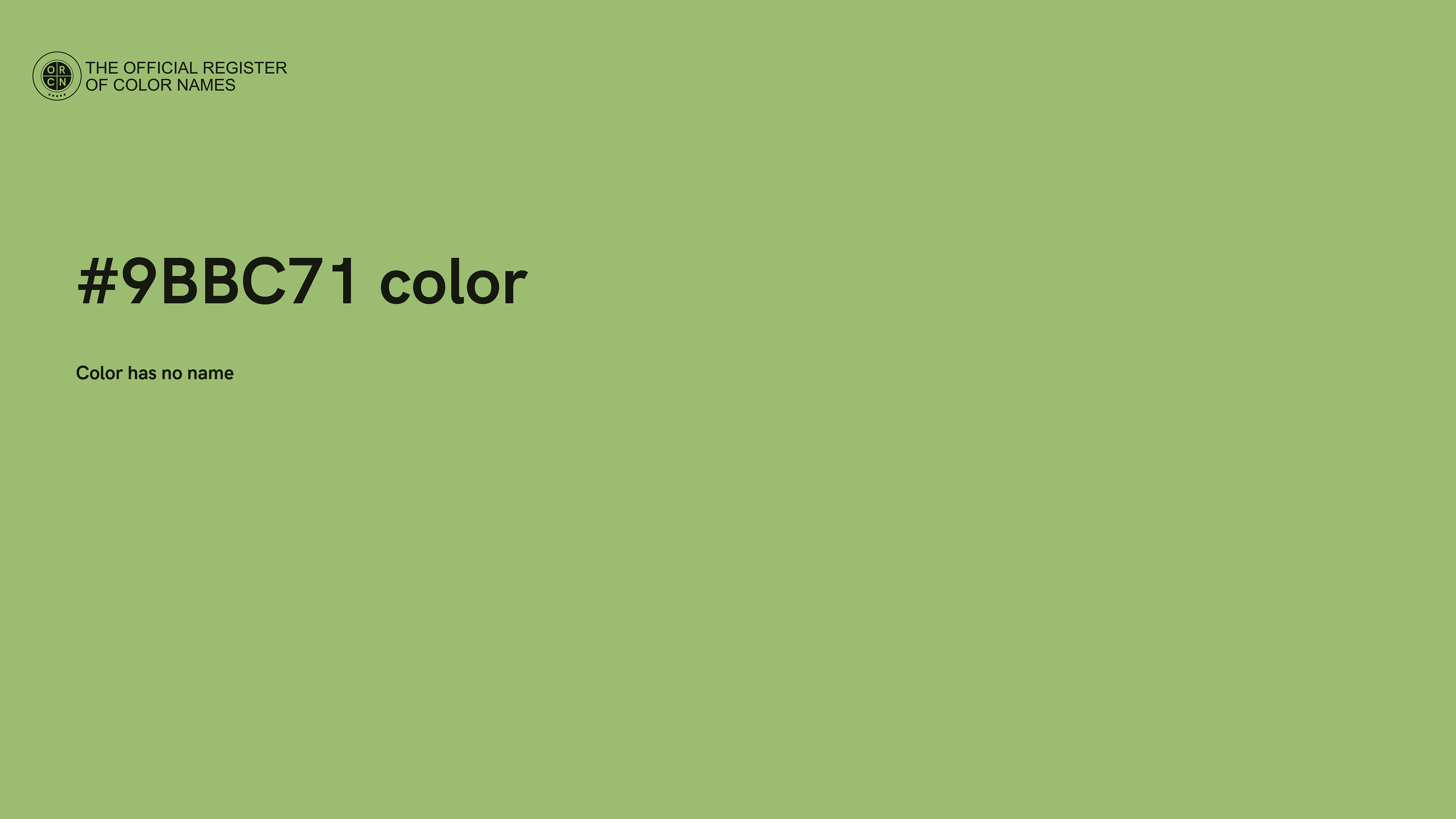 The digital color HEX #9BBC71 belongs to the Chartreuse Color Family featuring Mild Saturation (Saturation Family) and Light (Brightness Family).