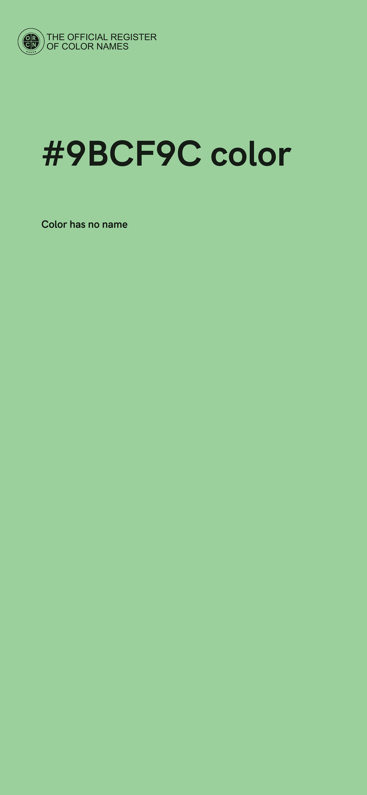 The digital color HEX #9BCF9C belongs to the Green Color Family featuring Mild Saturation (Saturation Family) and Very Light (Brightness Family).
