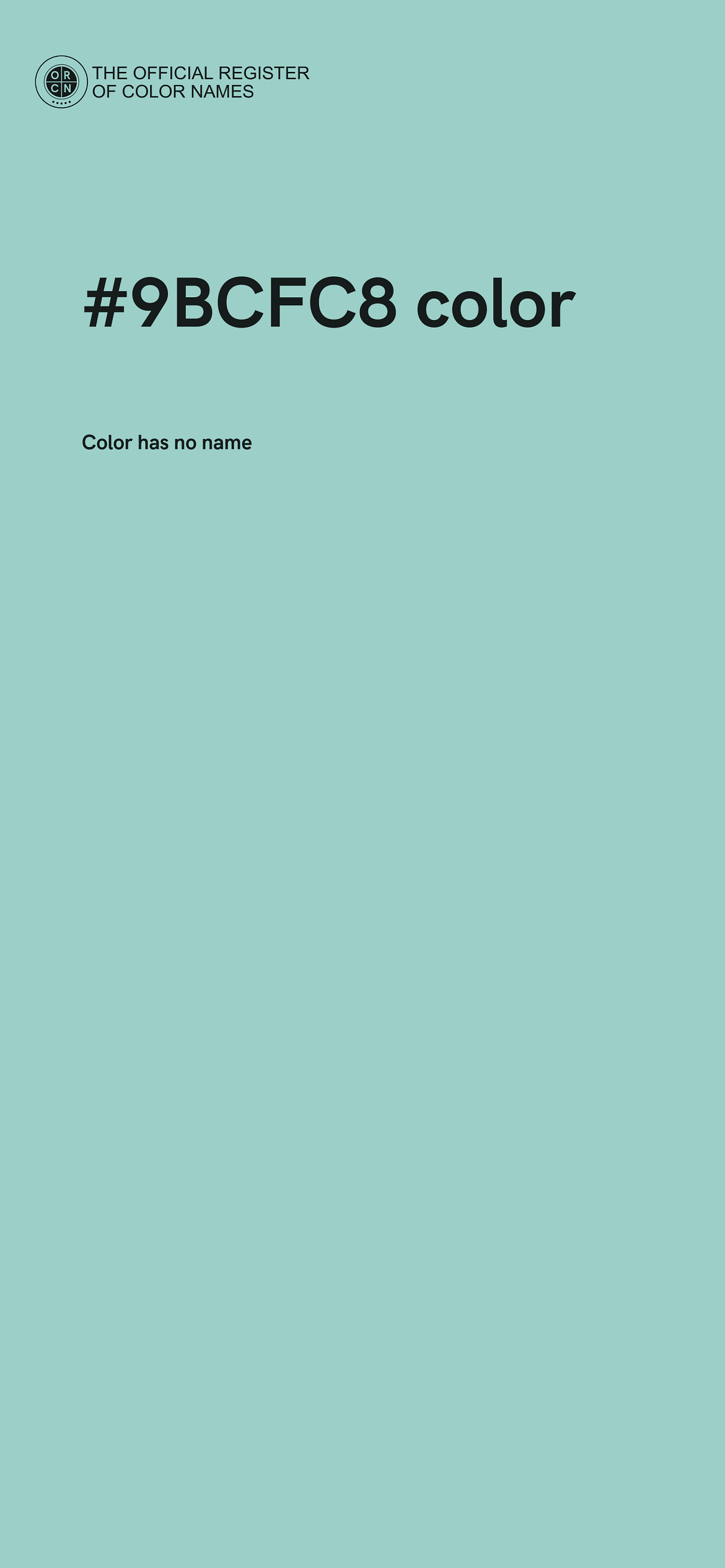 The digital color HEX #9BCFC8 belongs to the Cyan Color Family featuring Mild Saturation (Saturation Family) and Very Light (Brightness Family).