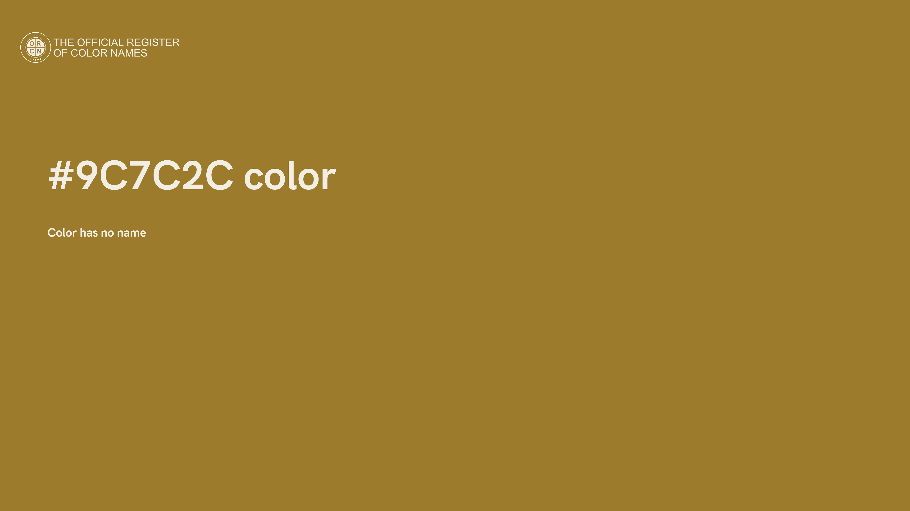 The digital color HEX #9C7C2C belongs to the Orange Color Family featuring Moderate Saturation (Saturation Family) and Neutral (Brightness Family).